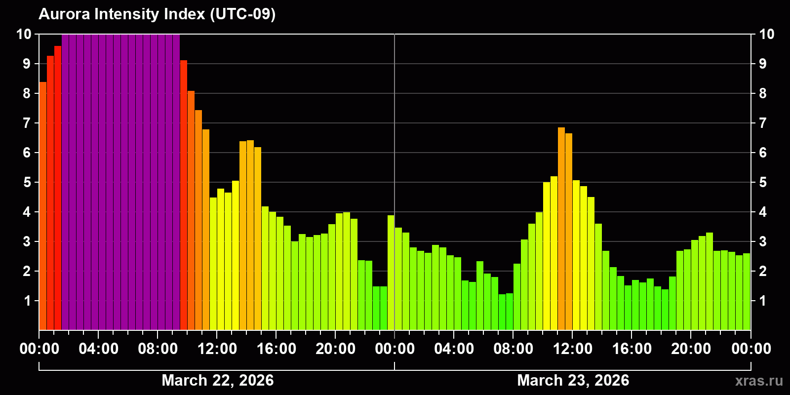 Changes in the auroral intensity index from 2026-03-22 to 2026-03-23 local time