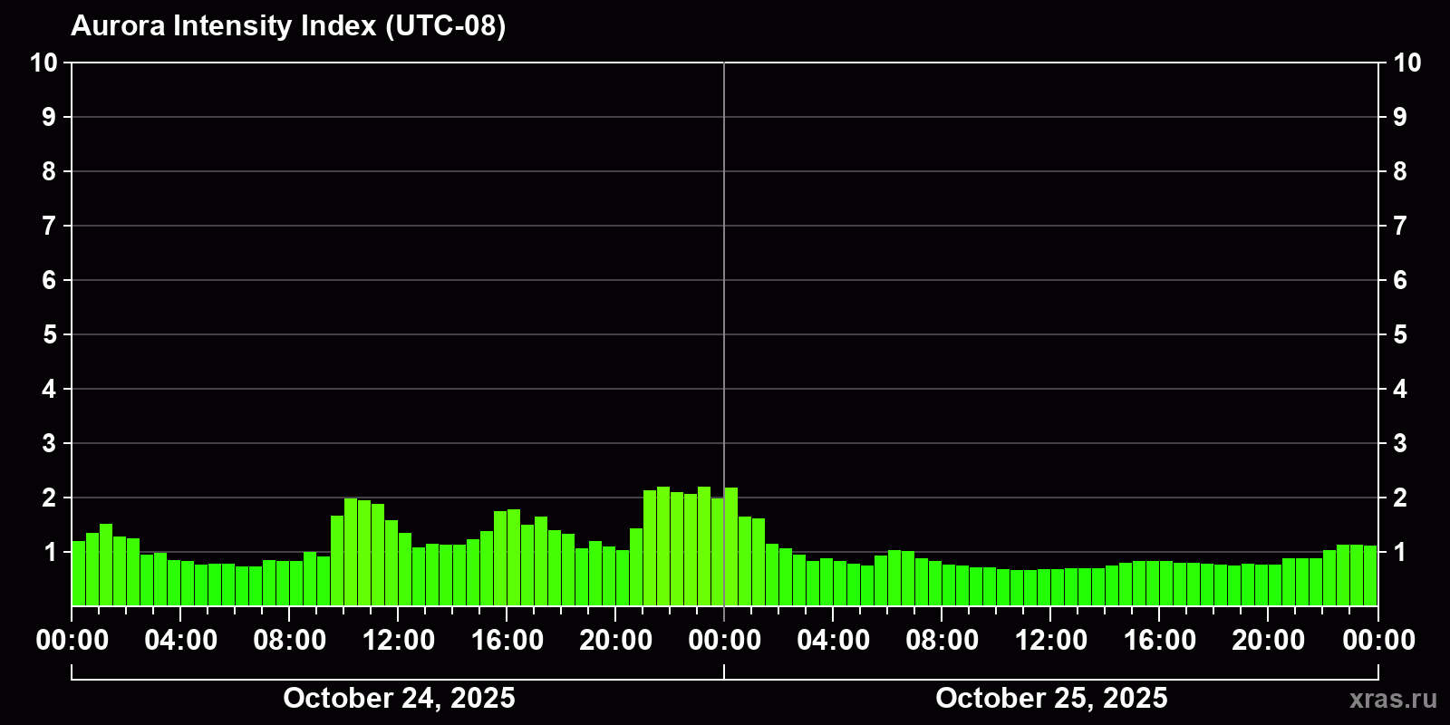 Changes in the auroral intensity index from 2025-10-24 to 2025-10-25 local time