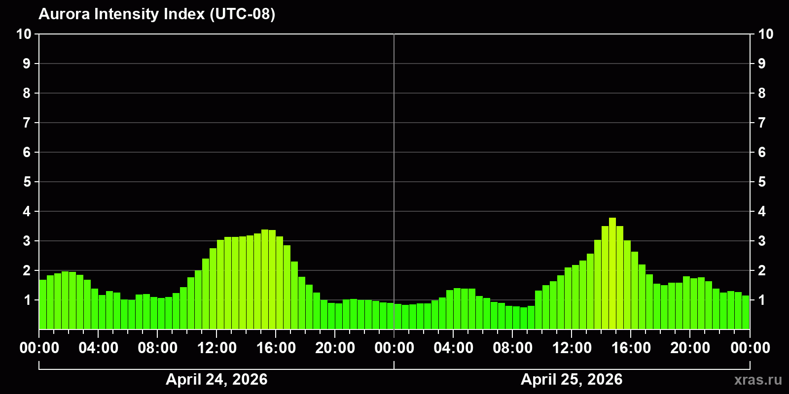 Changes in the auroral intensity index from 2026-04-24 to 2026-04-25 local time