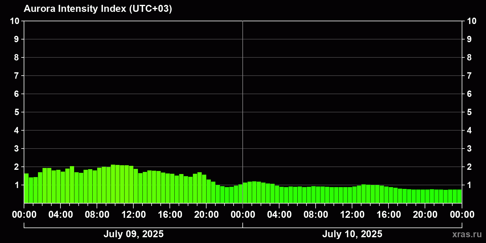 Changes in the auroral intensity index from 2025-07-09 to 2025-07-10 local time