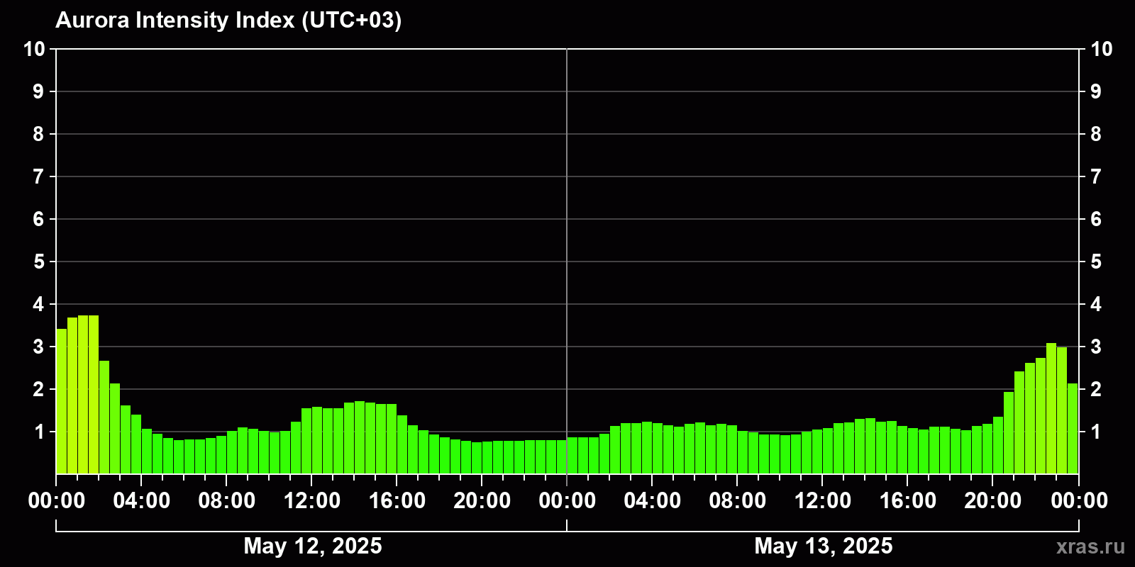 Auroral intensity index and the theoretically possible latitude of observations for nighttime in the Estern Hemisphere as of 2025-05-13 23:45 (end of day) local time
