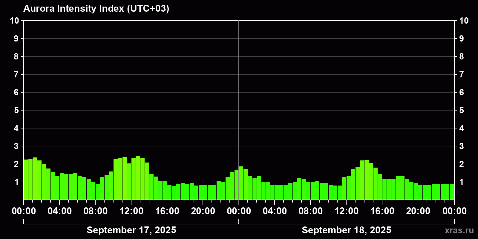 Auroral intensity index and the theoretically possible latitude of observations for nighttime in the Estern Hemisphere as of 2025-09-18 23:47 (end of day) local time