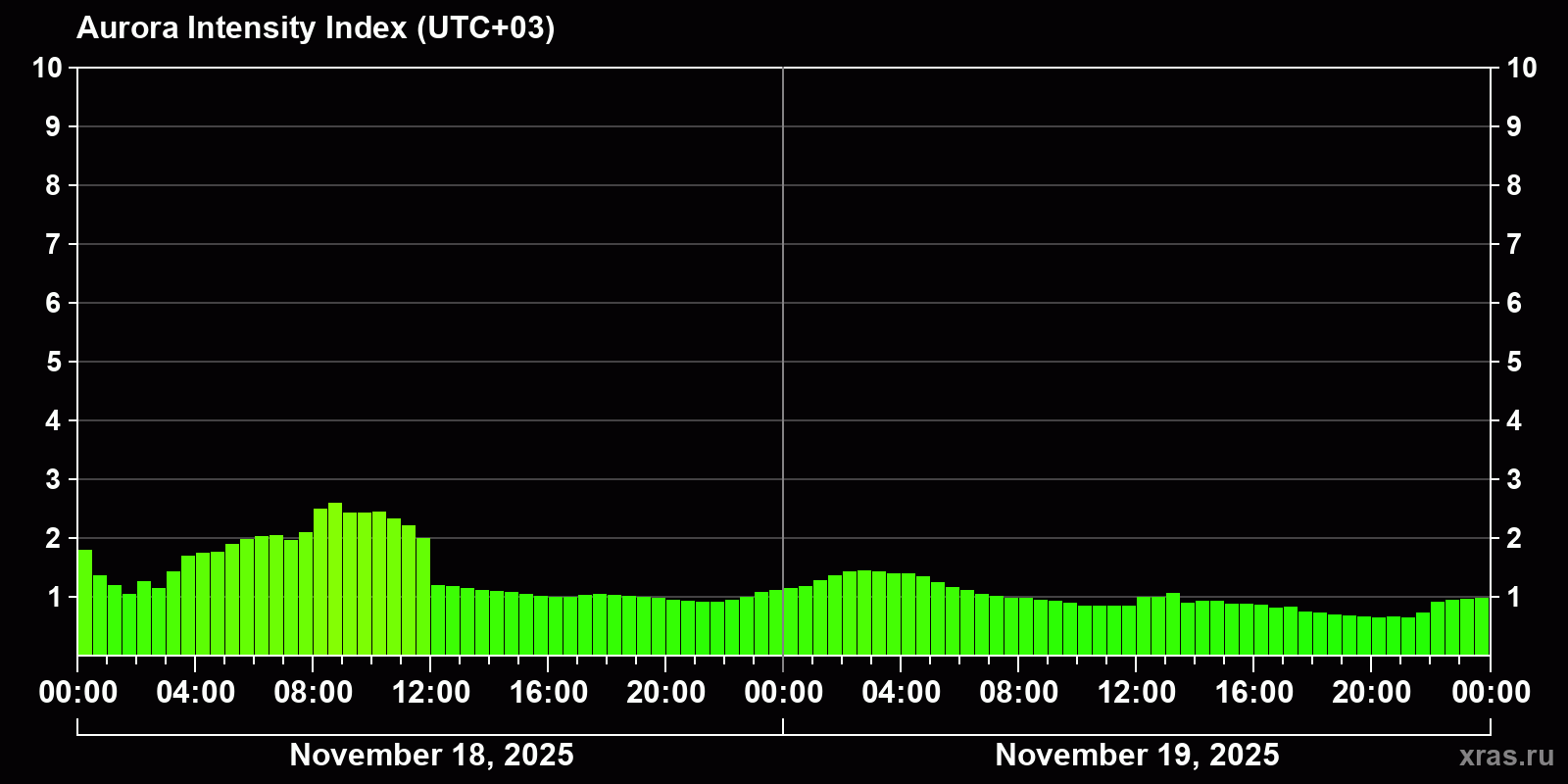 Changes in the auroral intensity index from 2025-11-18 to 2025-11-19 local time