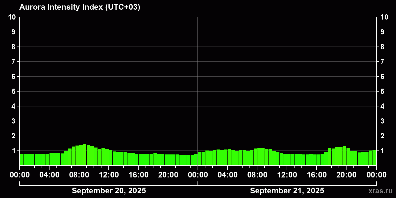 Auroral intensity index and the theoretically possible latitude of observations for nighttime in the Estern Hemisphere as of 2025-09-21 23:45 (end of day) local time