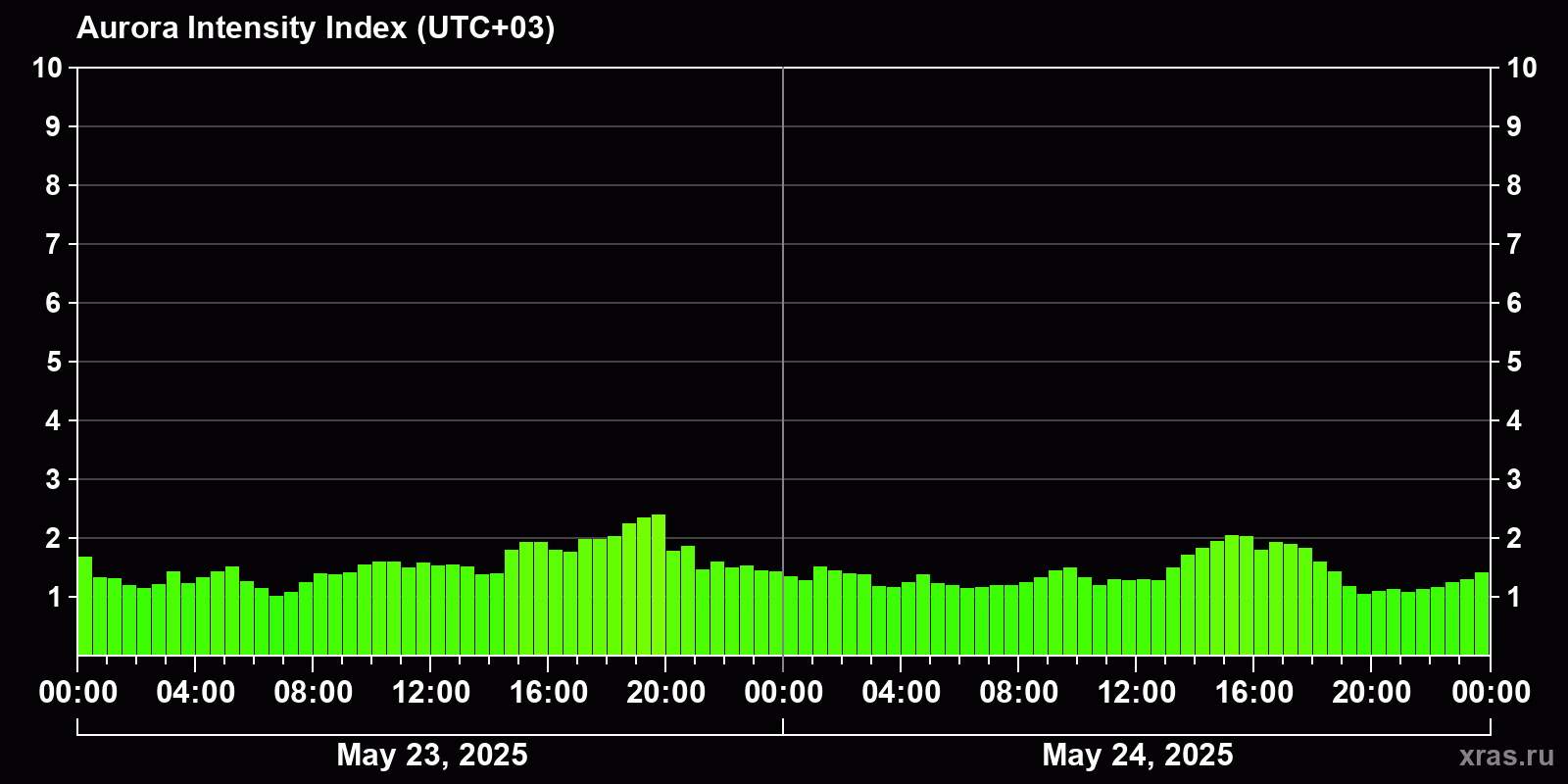 Auroral intensity index and the theoretically possible latitude of observations for nighttime in the Estern Hemisphere as of 2025-05-24 23:53 (end of day) local time