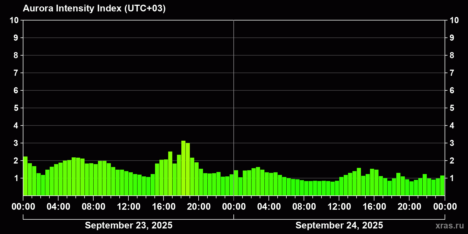 Auroral intensity index and the theoretically possible latitude of observations for nighttime in the Estern Hemisphere as of 2025-09-24 23:53 (end of day) local time