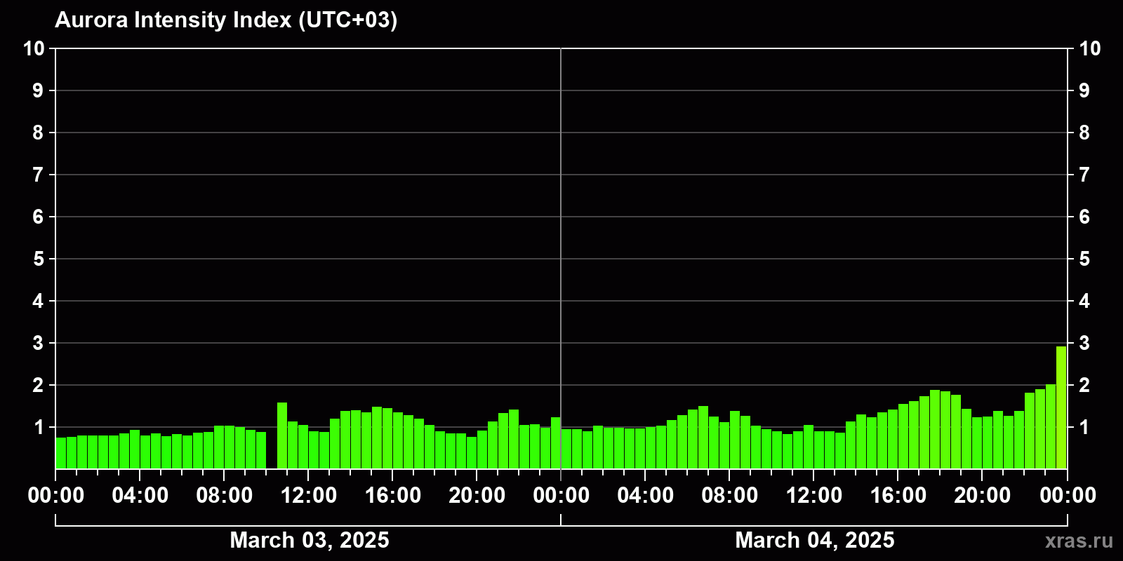 Auroral intensity index and the theoretically possible latitude of observations for nighttime in the Estern Hemisphere as of 2025-03-04 23:56 (end of day) local time