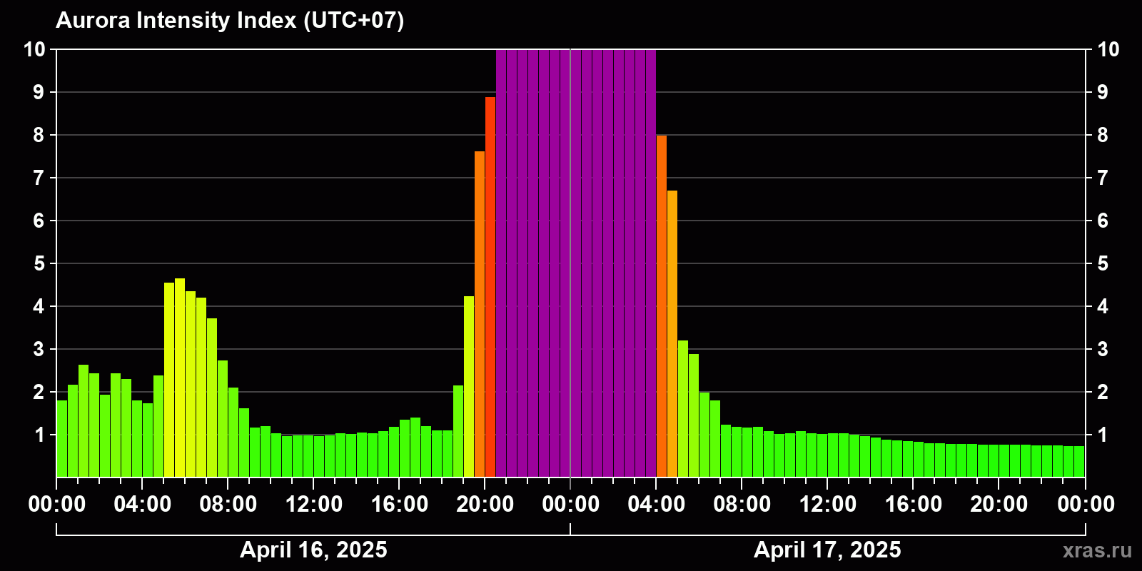 Changes in the auroral intensity index from 2025-04-16 to 2025-04-17 local time