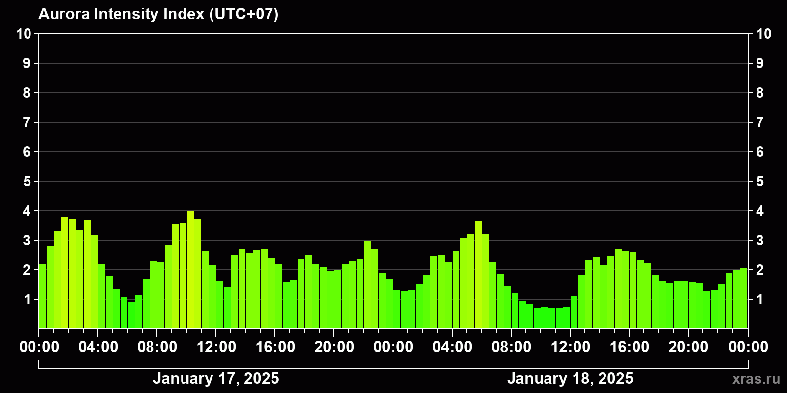 Changes in the auroral intensity index from 2025-01-17 to 2025-01-18 local time