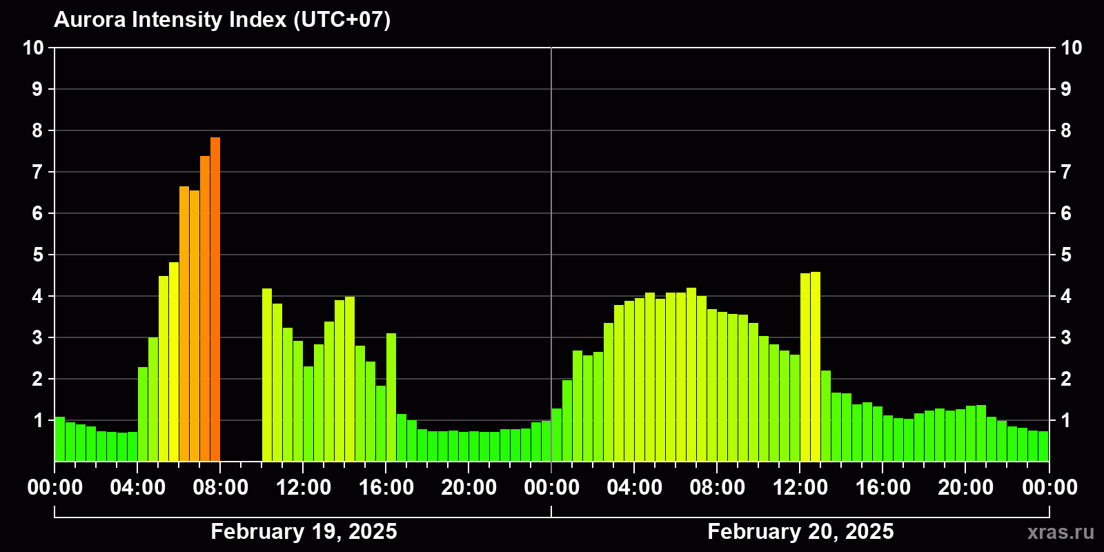 Auroral intensity index and the theoretically possible latitude of observations for nighttime in the Estern Hemisphere as of 2025-02-20 23:47 (end of day) local time