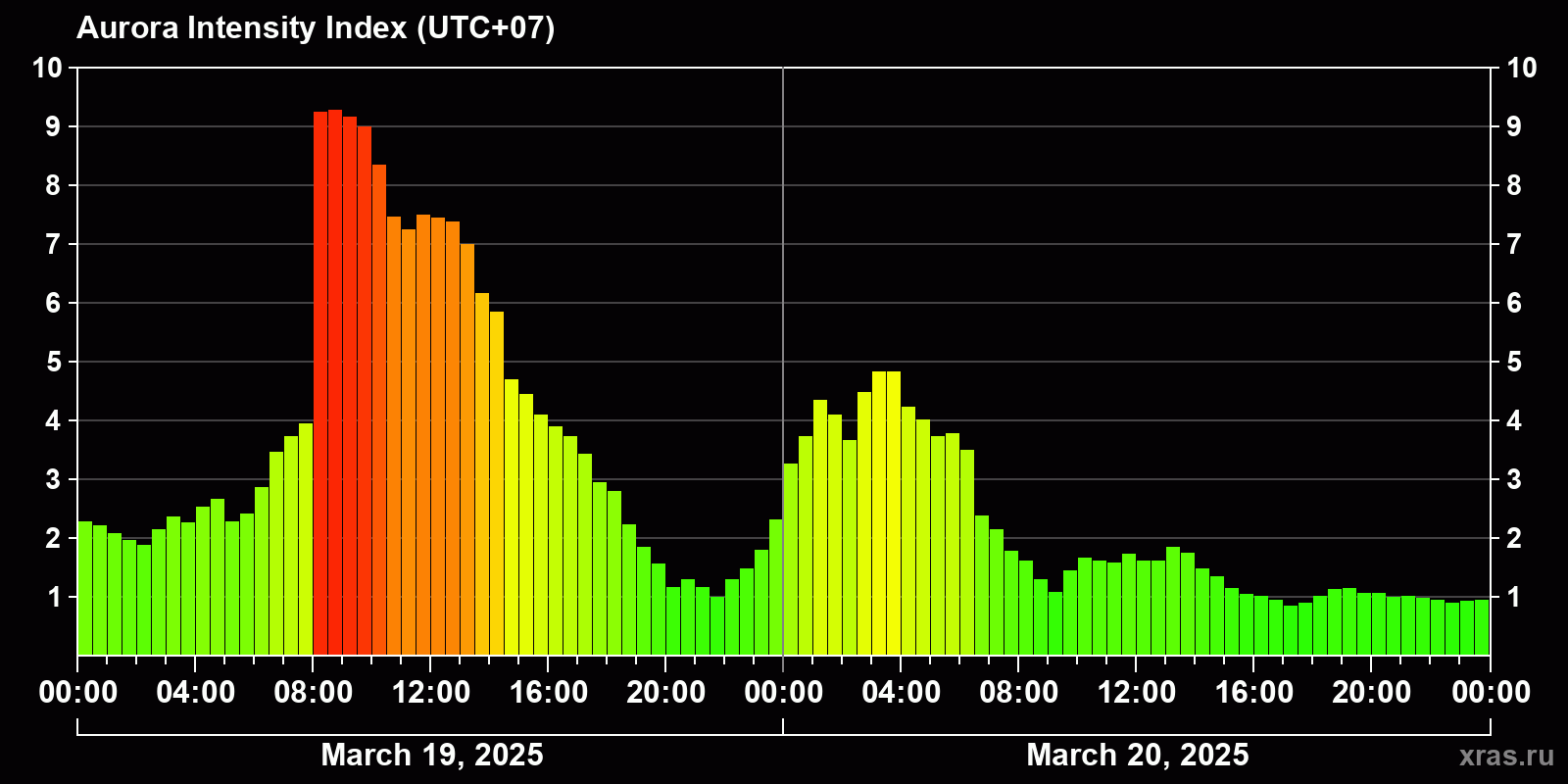 Changes in the auroral intensity index from 2025-03-19 to 2025-03-20 local time