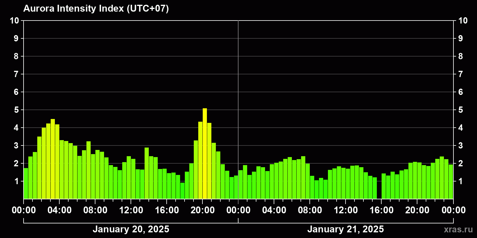 Changes in the auroral intensity index from 2025-01-20 to 2025-01-21 local time