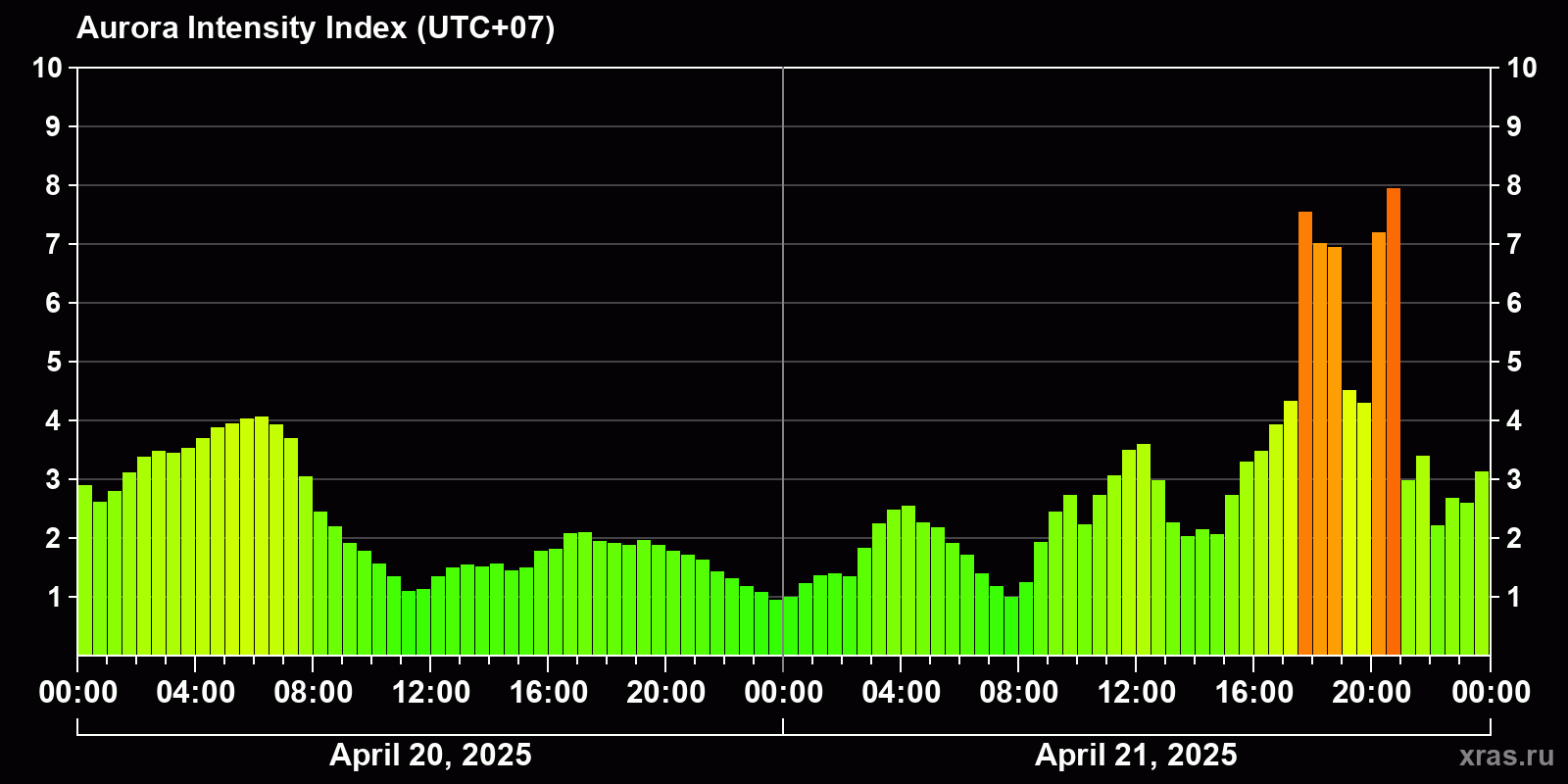 Changes in the auroral intensity index from 2025-04-20 to 2025-04-21 local time