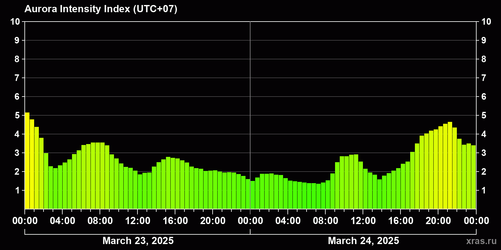 Auroral intensity index and the theoretically possible latitude of observations for nighttime in the Estern Hemisphere as of 2025-03-24 23:46 (end of day) local time