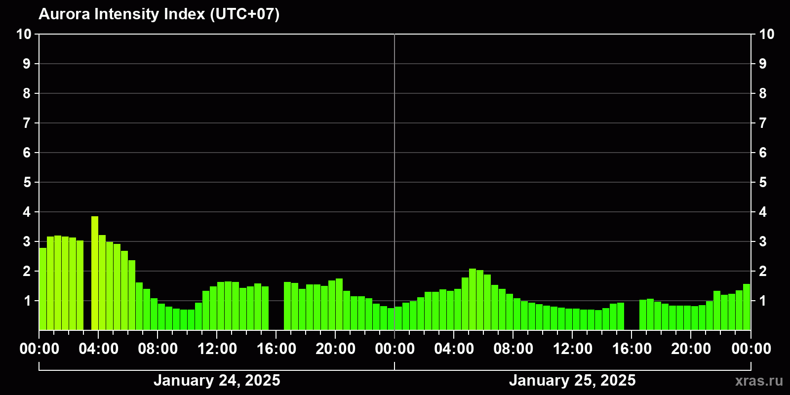 Auroral intensity index and the theoretically possible latitude of observations for nighttime in the Estern Hemisphere as of 2025-01-25 23:49 (end of day) local time