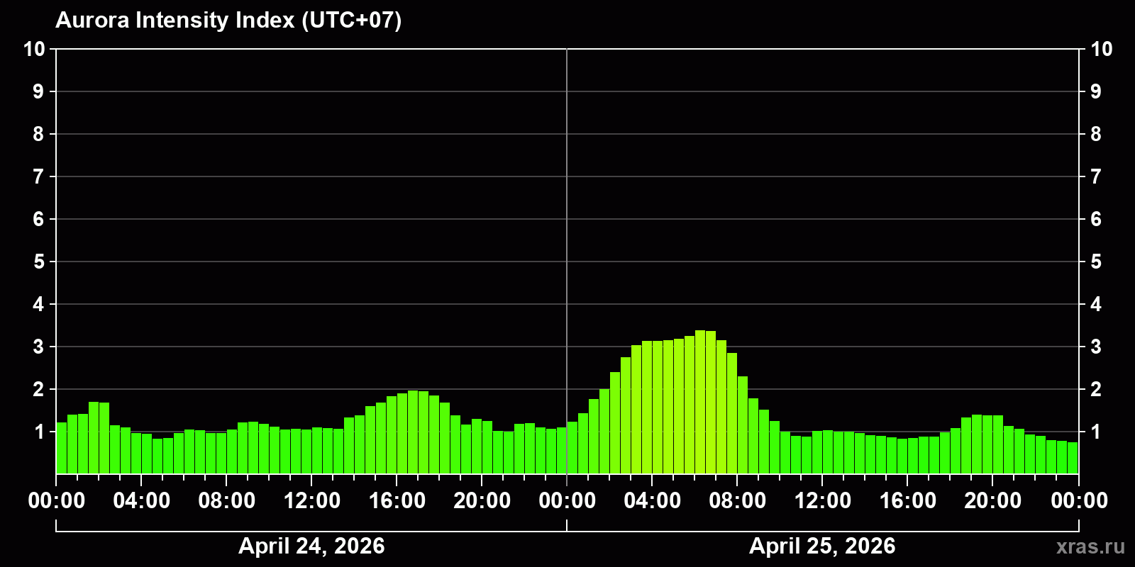 Auroral intensity index and the theoretically possible latitude of observations for nighttime in the Estern Hemisphere as of 2026-04-25 23:53 (end of day) local time