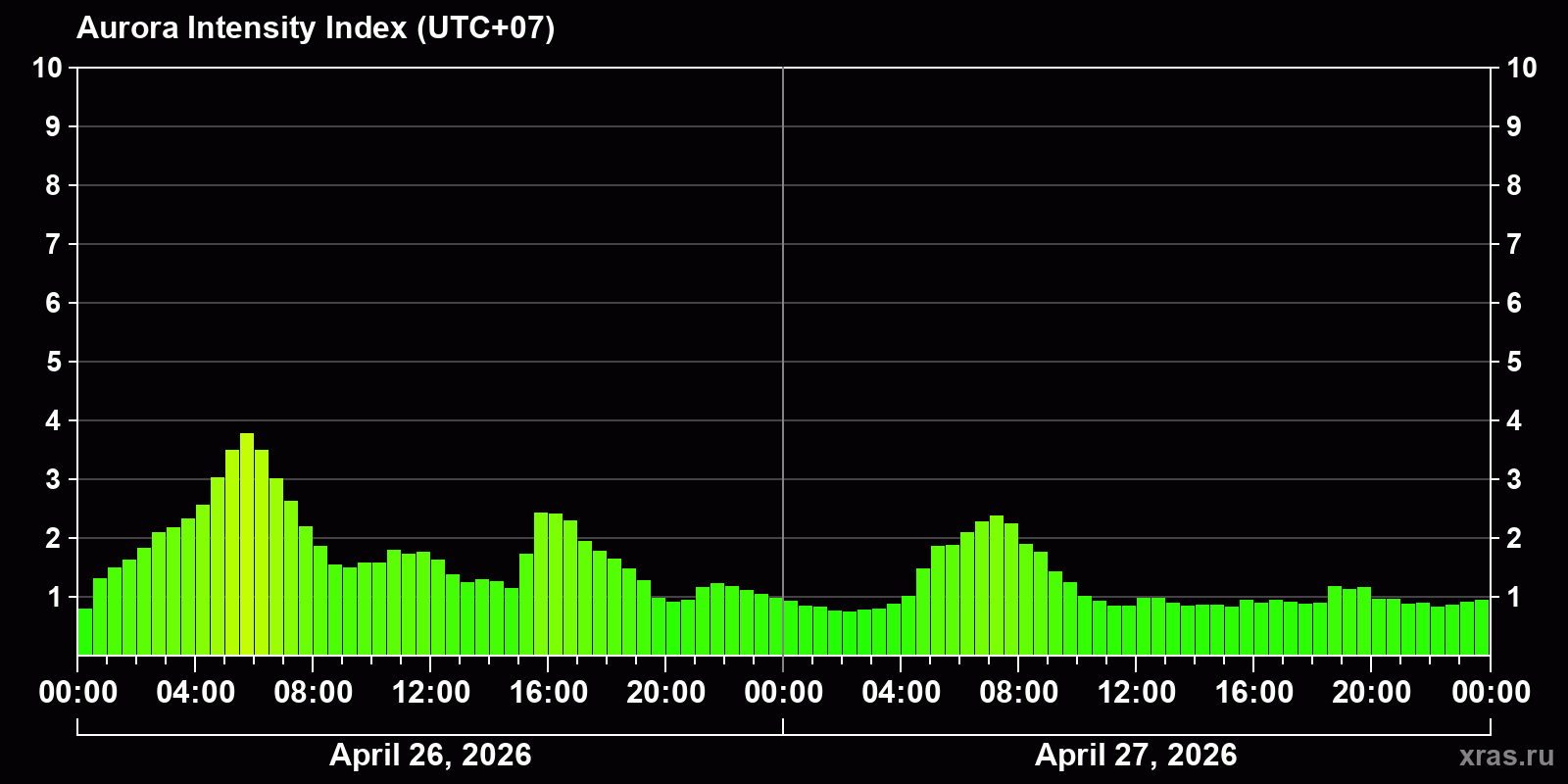 Auroral intensity index and the theoretically possible latitude of observations for nighttime in the Estern Hemisphere as of 2026-04-27 23:45 (end of day) local time