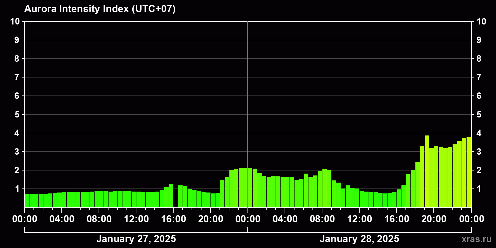 Changes in the auroral intensity index from 2025-01-27 to 2025-01-28 local time