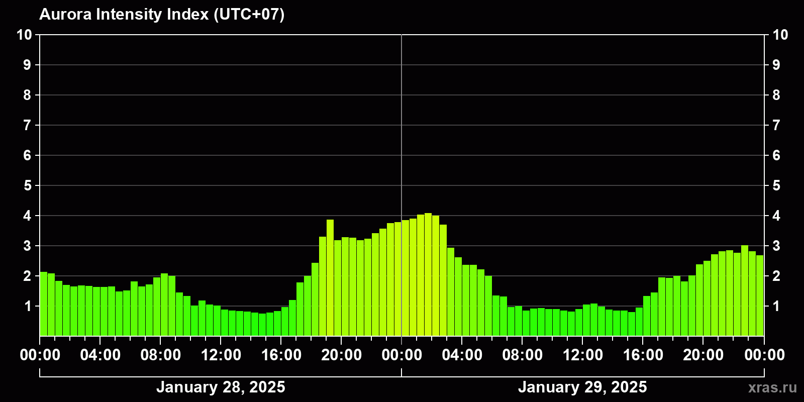 Auroral intensity index and the theoretically possible latitude of observations for nighttime in the Estern Hemisphere as of 2025-01-29 23:45 (end of day) local time