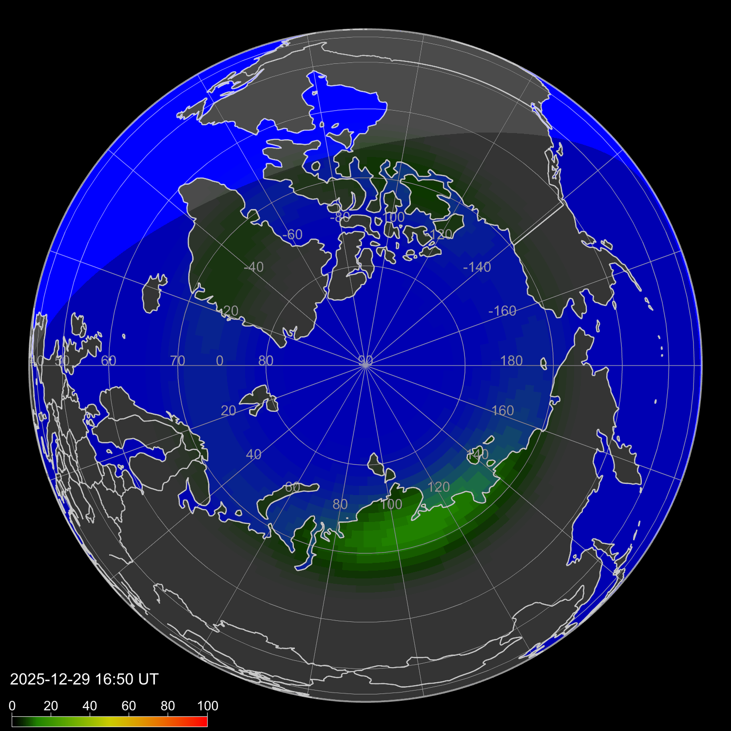 Изменения и часовой прогноз индекса интенсивности полярных сияний с 2025-12-29 по 2025-12-30