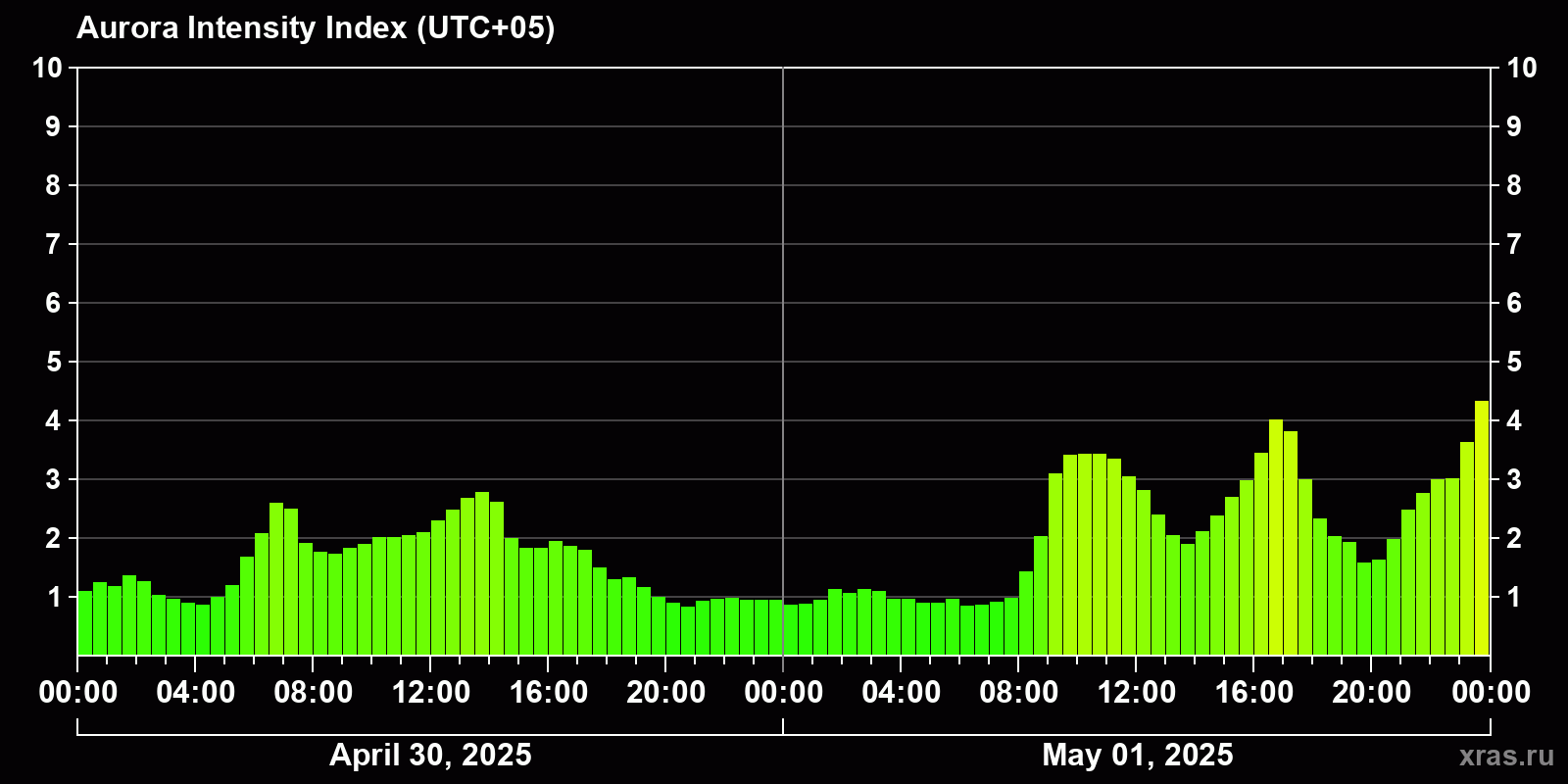 Auroral intensity index and the theoretically possible latitude of observations for nighttime in the Estern Hemisphere as of 2025-05-01 23:58 (end of day) local time