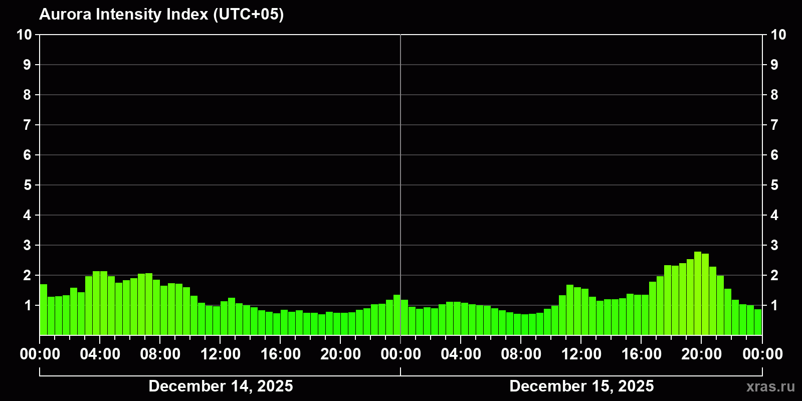 Auroral intensity index and the theoretically possible latitude of observations for nighttime in the Estern Hemisphere as of 2025-12-15 23:45 (end of day) local time