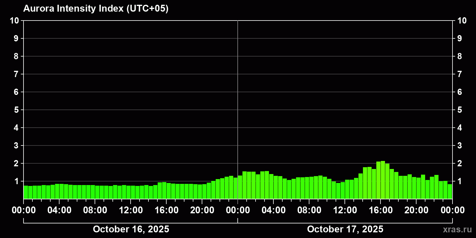 Changes in the auroral intensity index from 2025-10-16 to 2025-10-17 local time