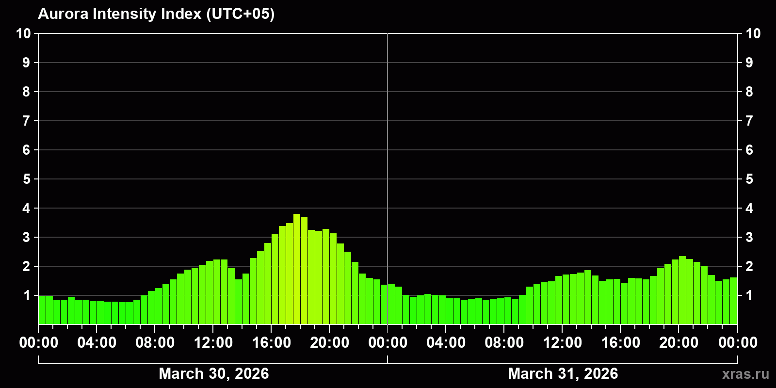 Auroral intensity index and the theoretically possible latitude of observations for nighttime in the Estern Hemisphere as of 2026-03-31 23:46 (end of day) local time