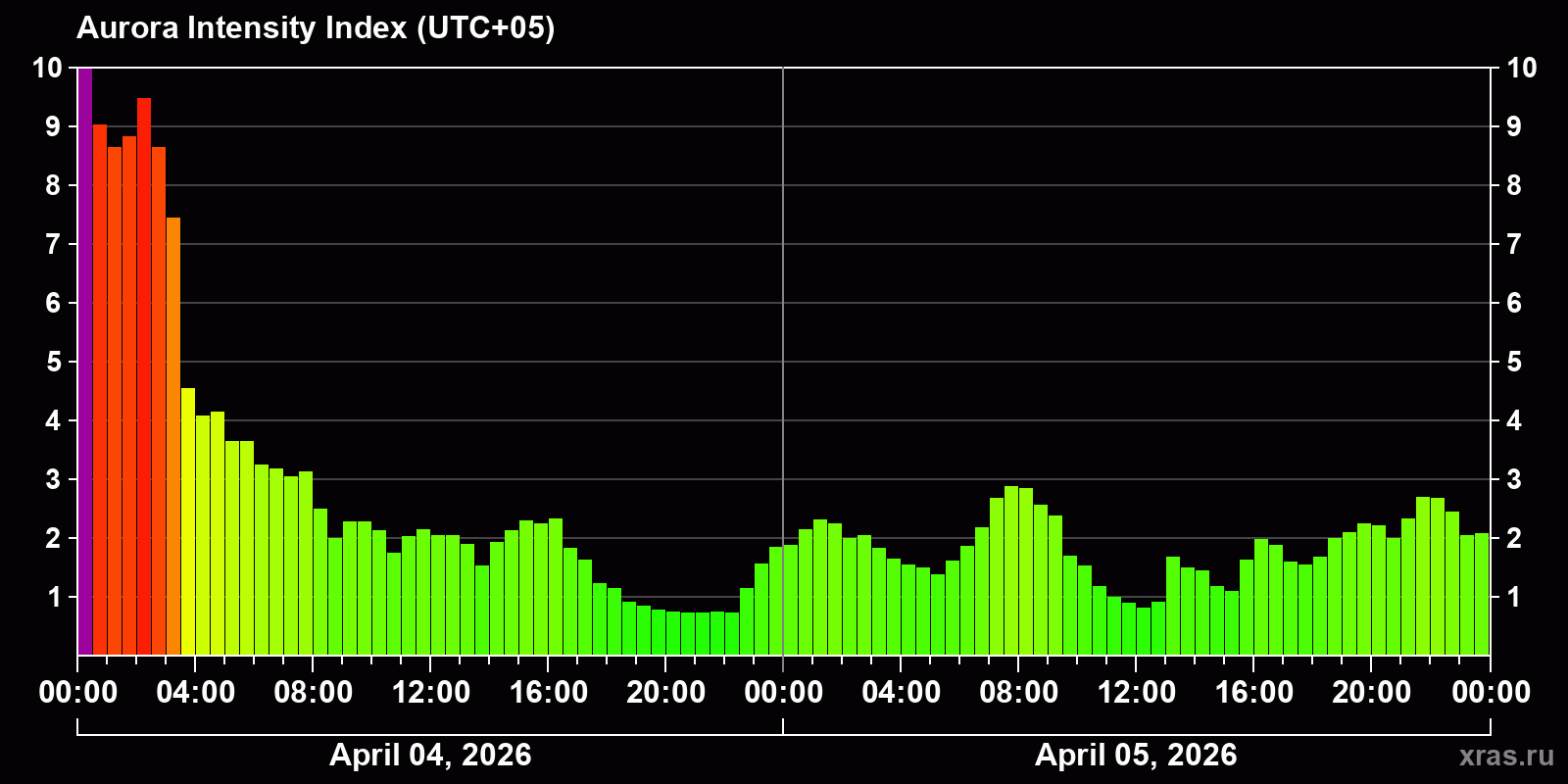 Auroral intensity index and the theoretically possible latitude of observations for nighttime in the Estern Hemisphere as of 2026-04-05 23:53 (end of day) local time