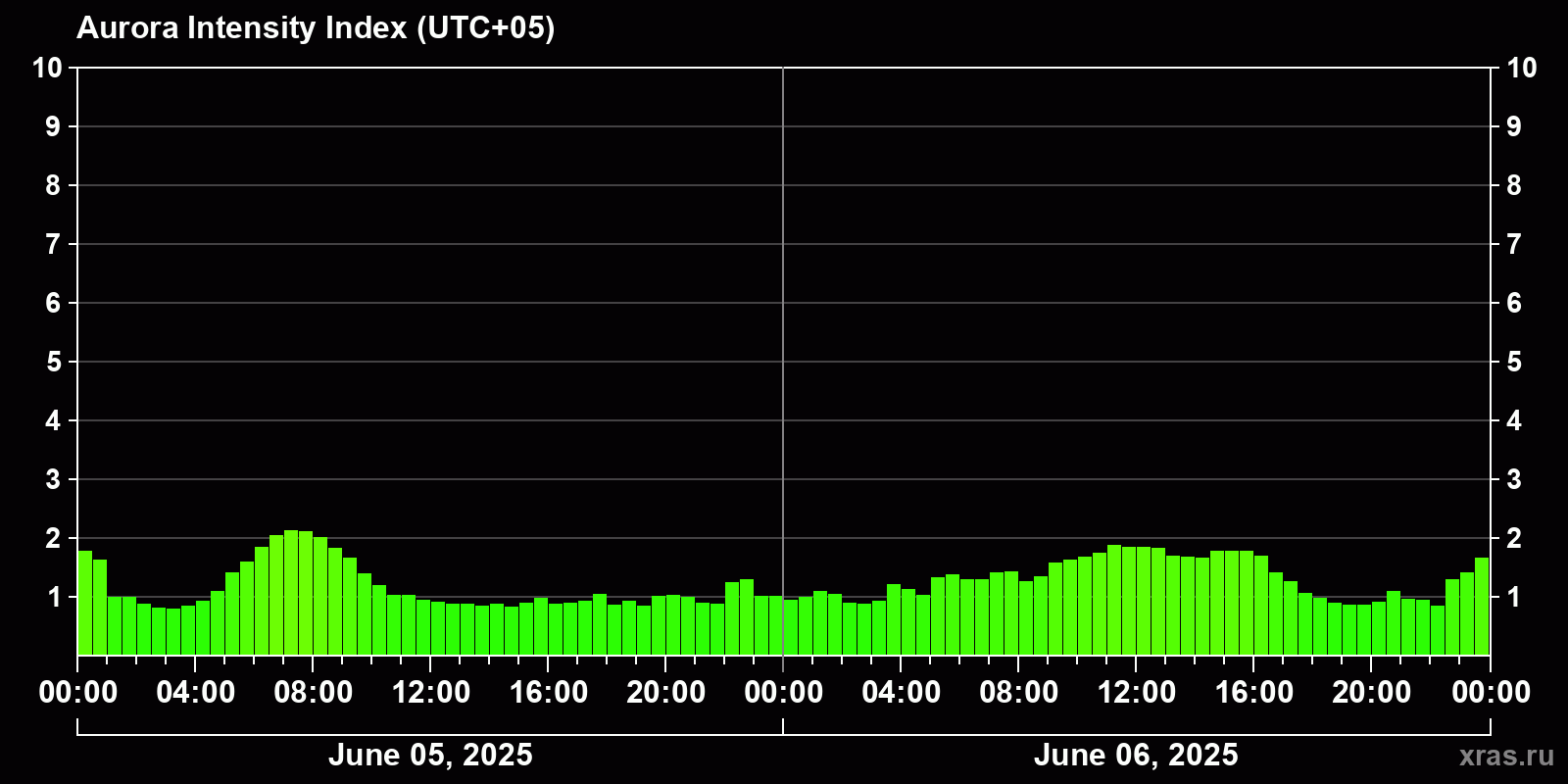 Changes in the auroral intensity index from 2025-06-05 to 2025-06-06 local time