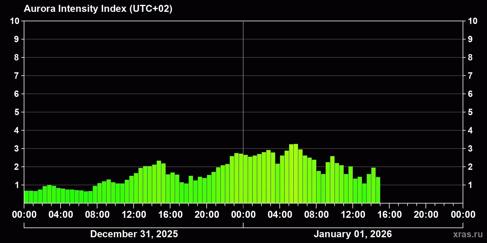 Auroral intensity index and the theoretically possible latitude of observations for nighttime in the Estern Hemisphere as of 2026-01-01 07:57 (end of day) local time