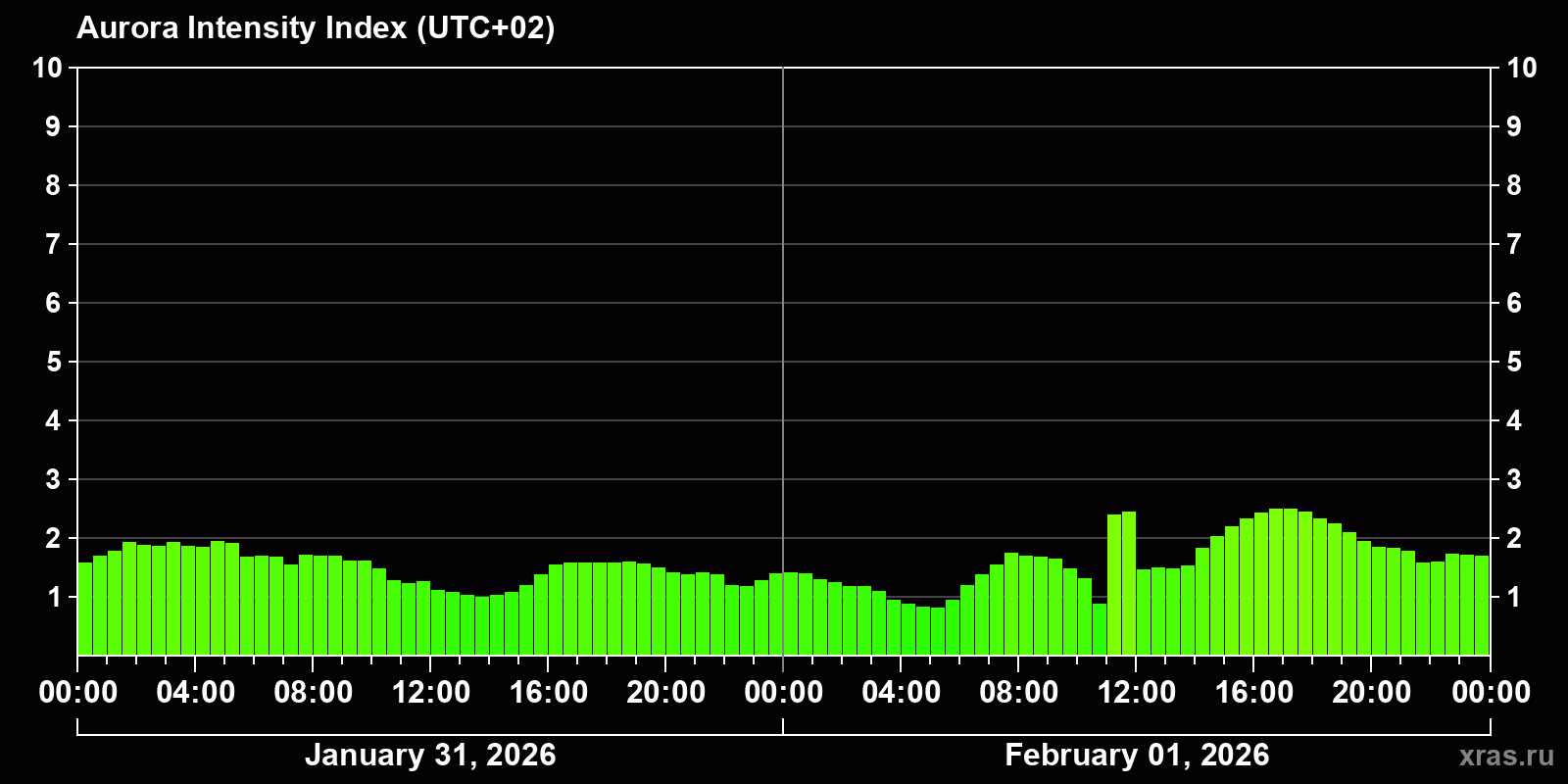 Auroral intensity index and the theoretically possible latitude of observations for nighttime in the Estern Hemisphere as of 2026-02-01 23:58 (end of day) local time