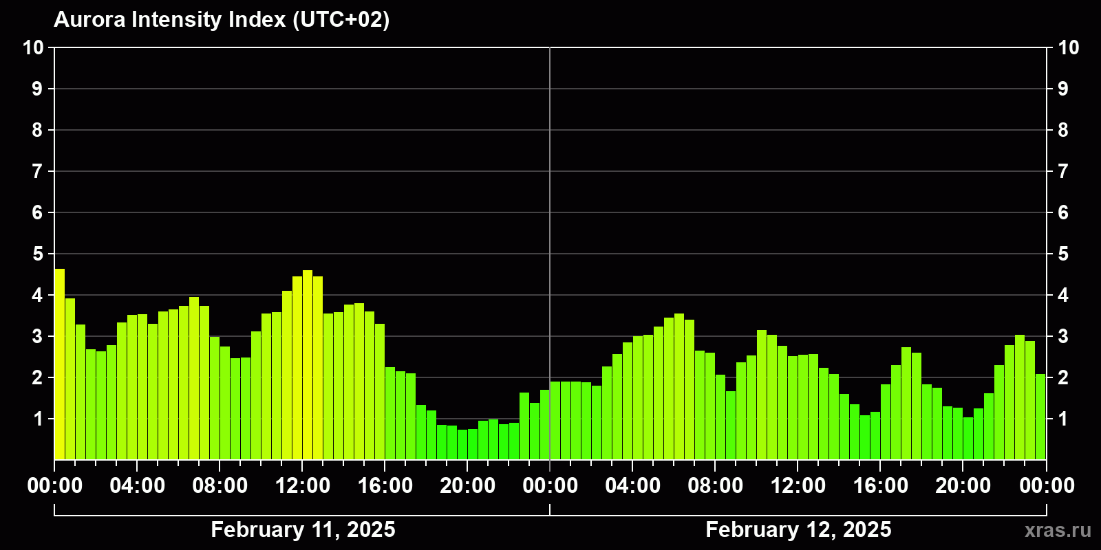 Auroral intensity index and the theoretically possible latitude of observations for nighttime in the Estern Hemisphere as of 2025-02-12 23:46 (end of day) local time