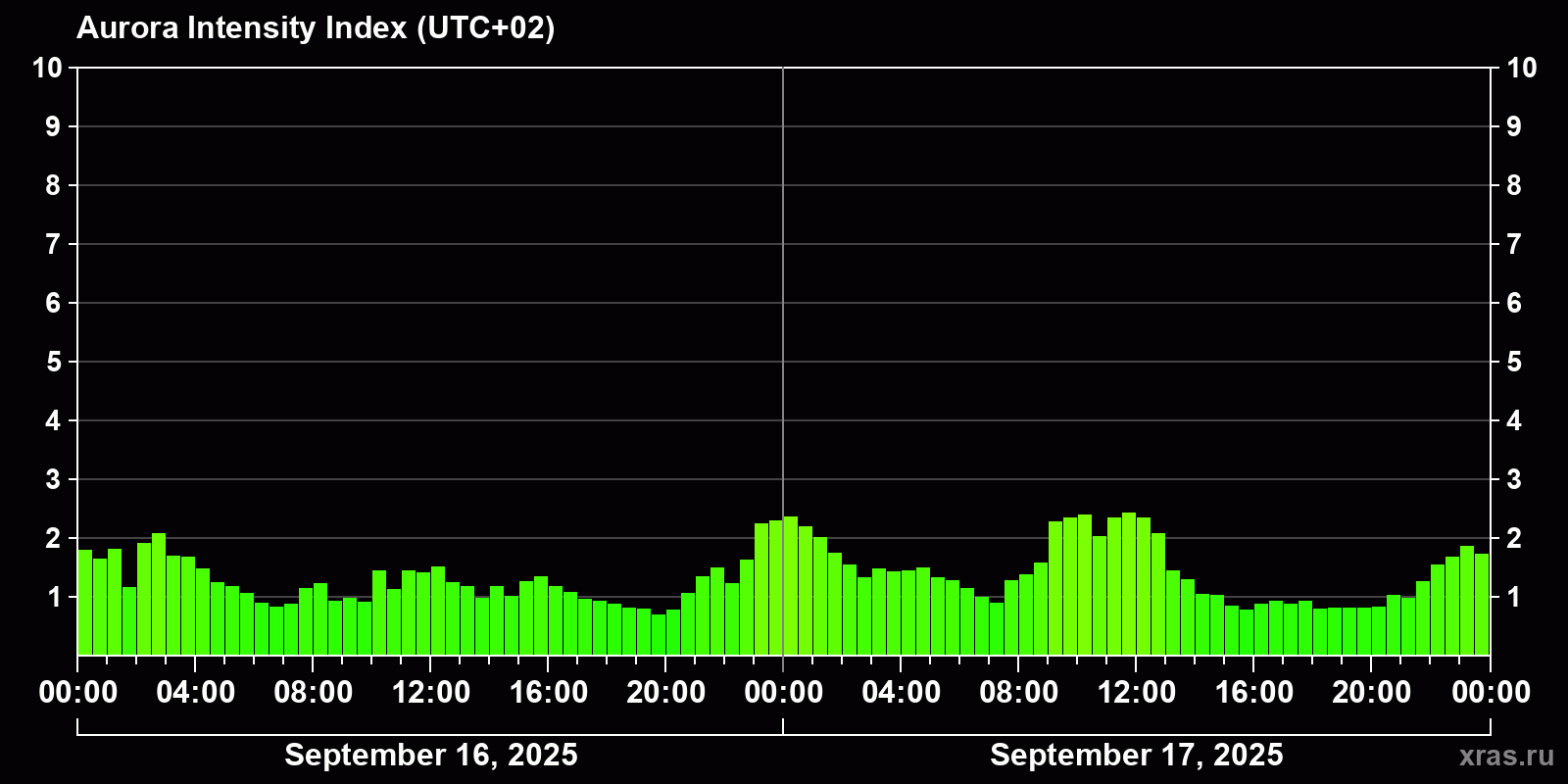 Auroral intensity index and the theoretically possible latitude of observations for nighttime in the Estern Hemisphere as of 2025-09-17 23:57 (end of day) local time