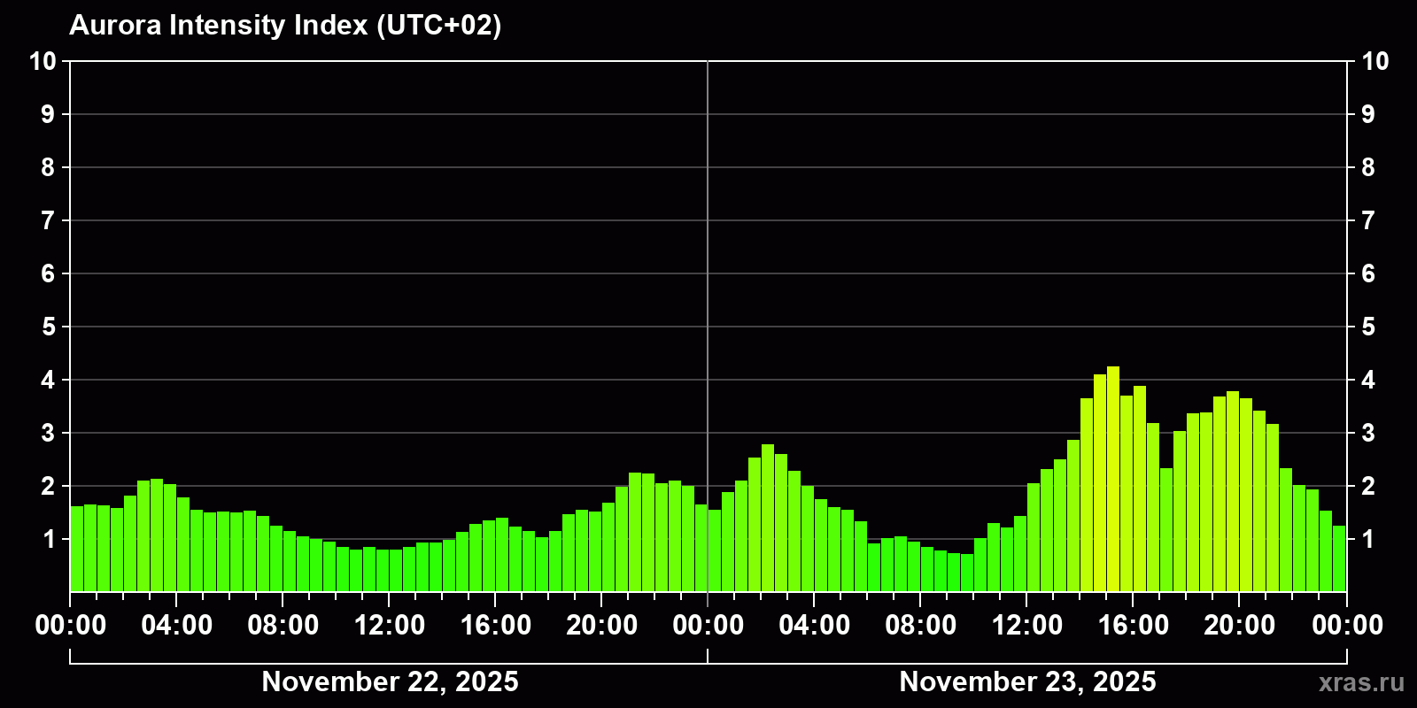 Auroral intensity index and the theoretically possible latitude of observations for nighttime in the Estern Hemisphere as of 2025-11-23 23:57 (end of day) local time