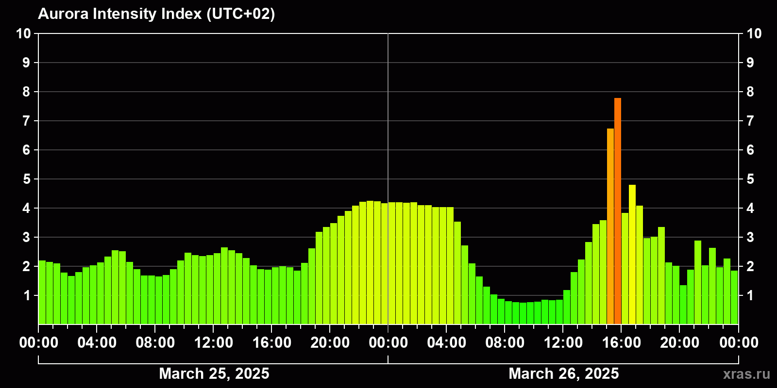 Auroral intensity index and the theoretically possible latitude of observations for nighttime in the Estern Hemisphere as of 2025-03-26 23:52 (end of day) local time