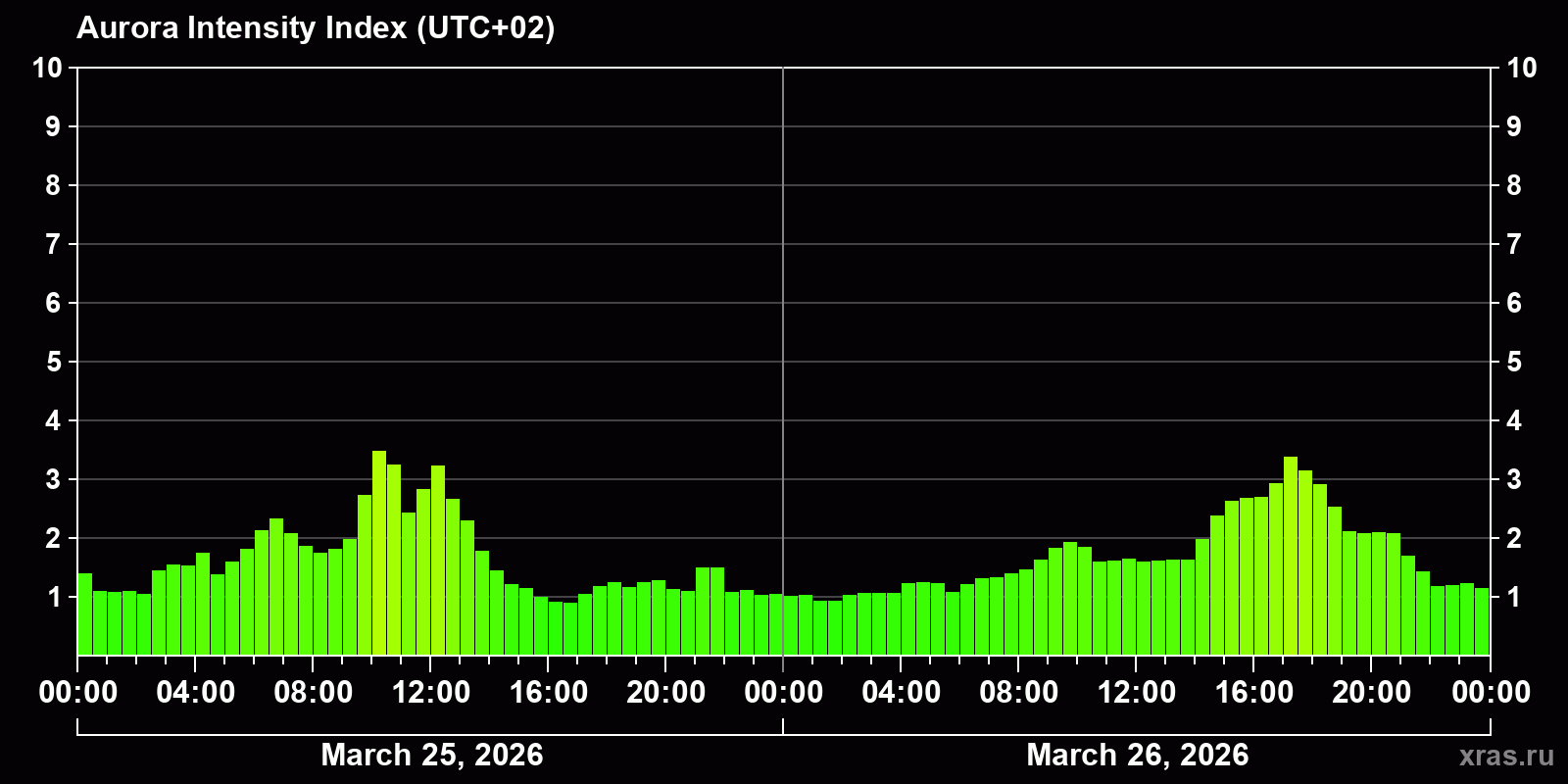 Changes in the auroral intensity index from 2026-03-25 to 2026-03-26 local time