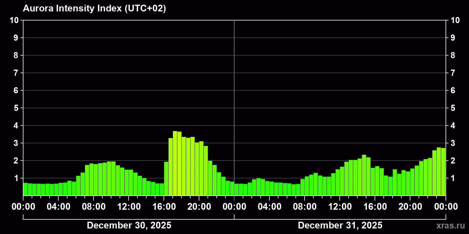 Changes in the auroral intensity index from 2025-12-30 to 2025-12-31 local time