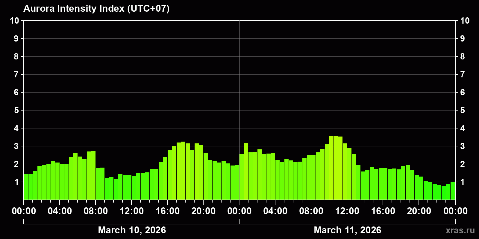 Changes in the auroral intensity index from 2026-03-10 to 2026-03-11 local time