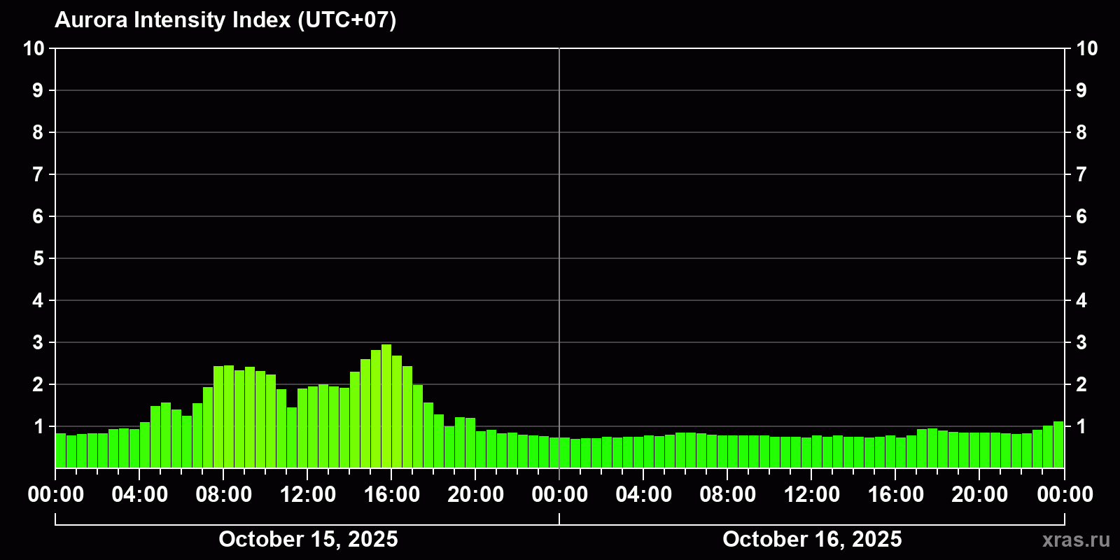 Changes in the auroral intensity index from 2025-10-15 to 2025-10-16 local time