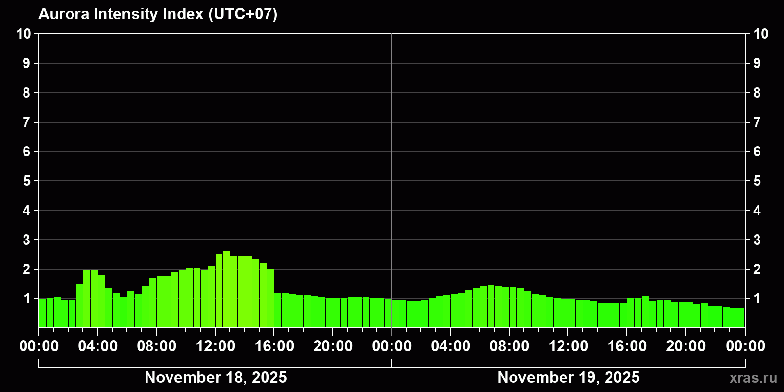 Changes in the auroral intensity index from 2025-11-18 to 2025-11-19 local time