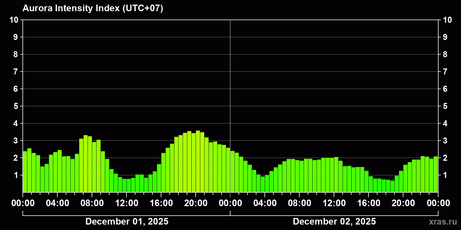 Auroral intensity index and the theoretically possible latitude of observations for nighttime in the Estern Hemisphere as of 2025-12-02 23:58 (end of day) local time