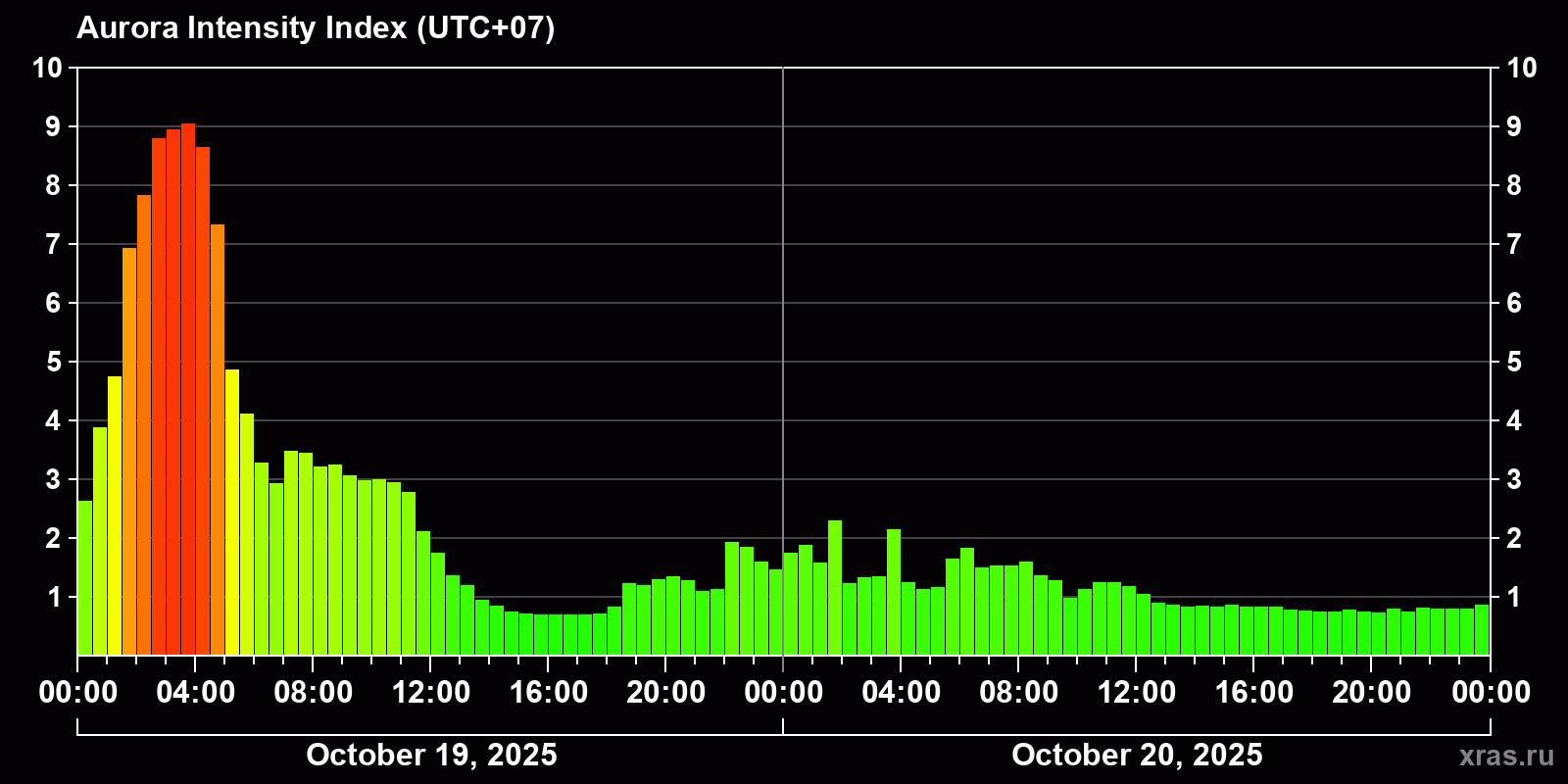 Auroral intensity index and the theoretically possible latitude of observations for nighttime in the Estern Hemisphere as of 2025-10-20 23:52 (end of day) local time