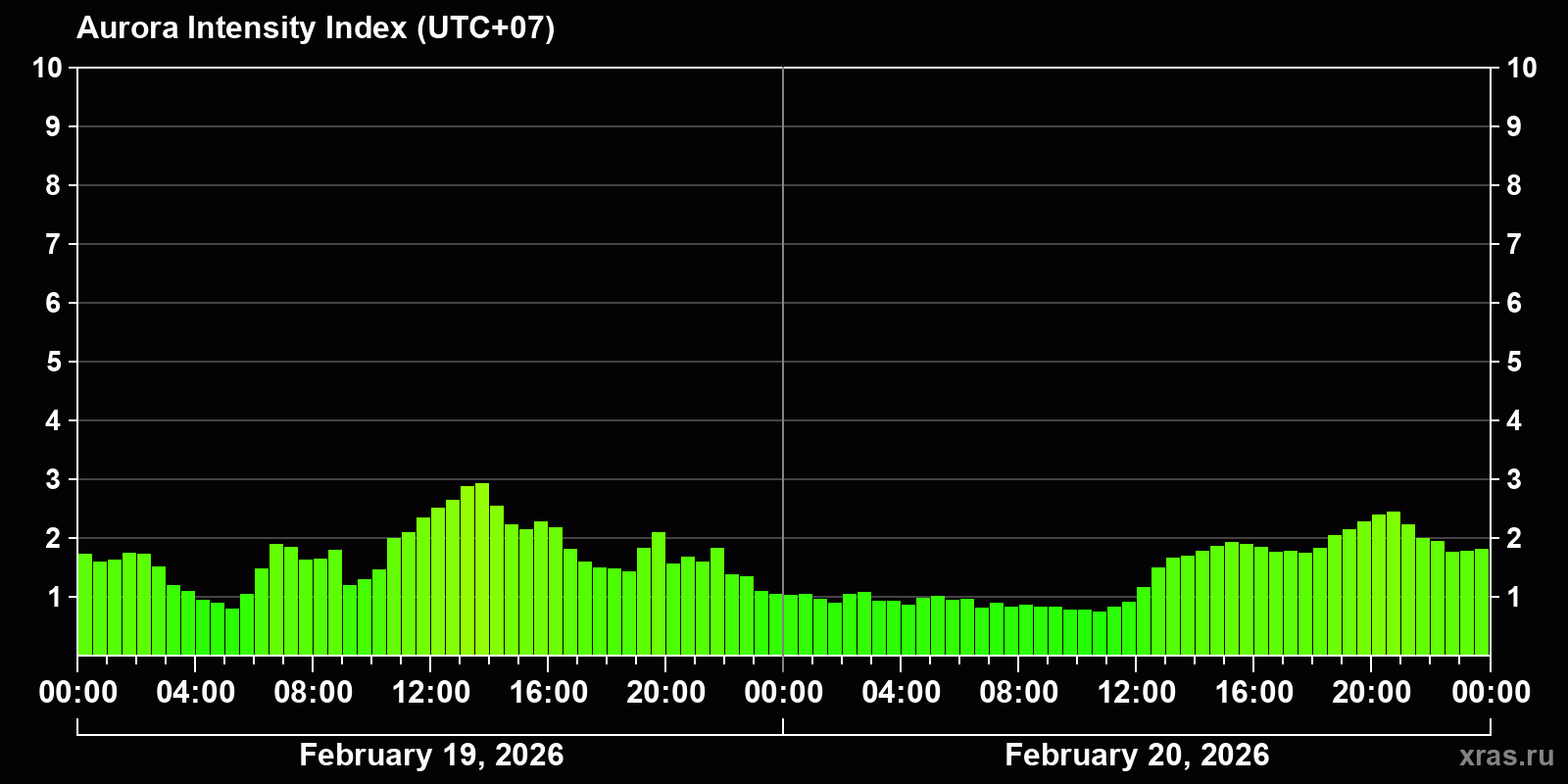 Changes in the auroral intensity index from 2026-02-19 to 2026-02-20 local time