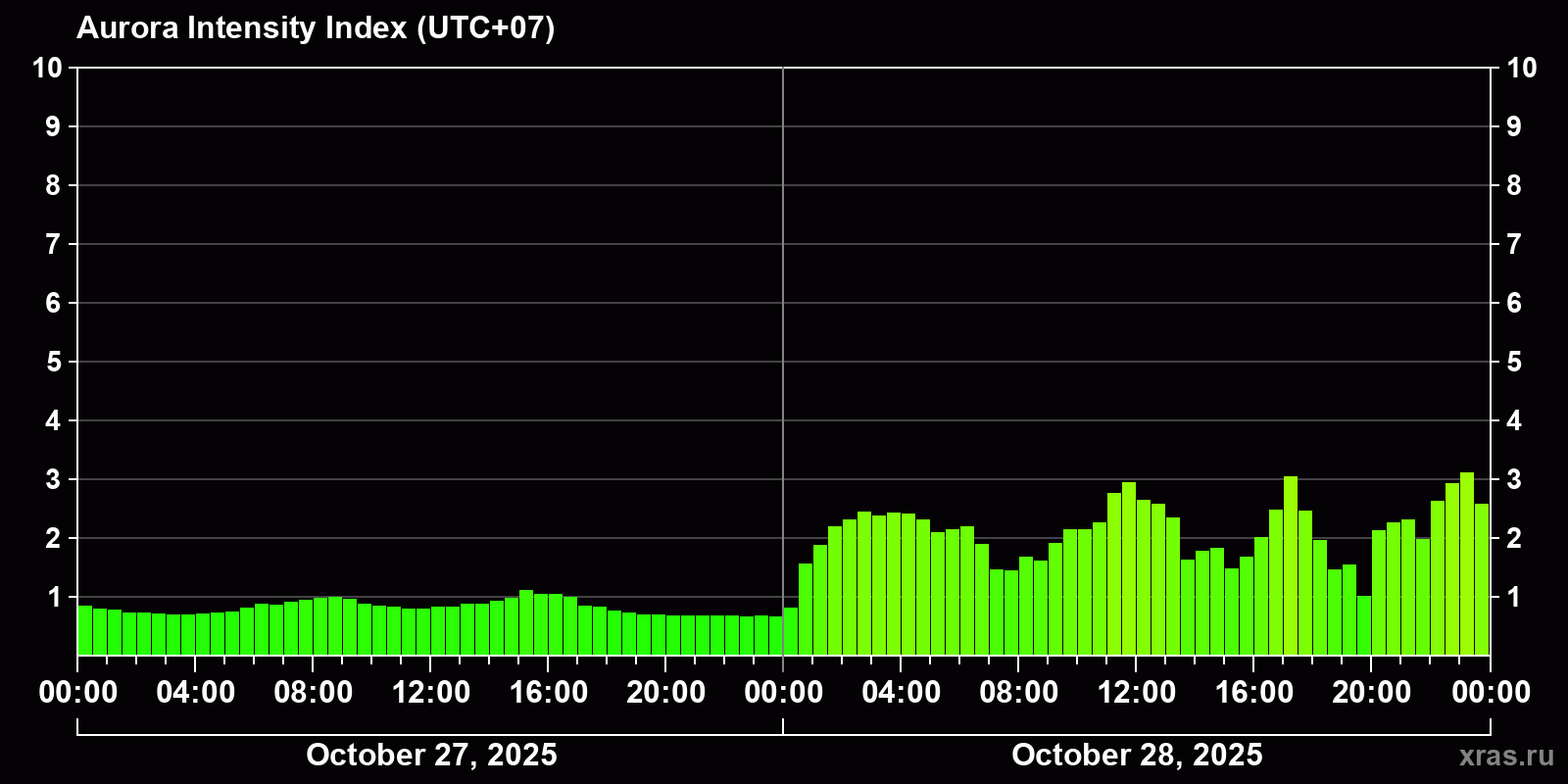 Changes in the auroral intensity index from 2025-10-27 to 2025-10-28 local time