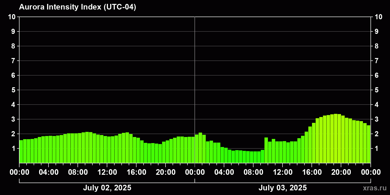 Auroral intensity index and the theoretically possible latitude of observations for nighttime in the Western Hemisphere as of 2025-07-03 23:58 (end of day) local time