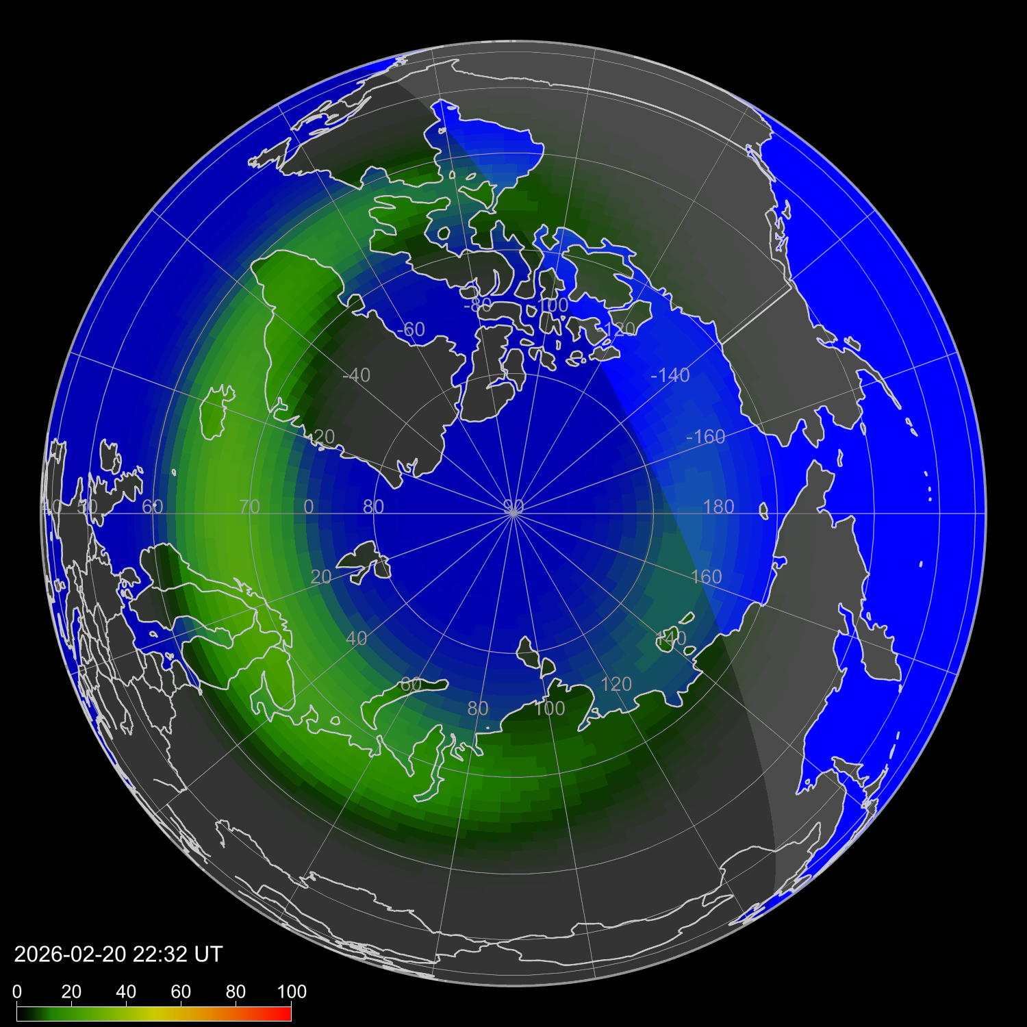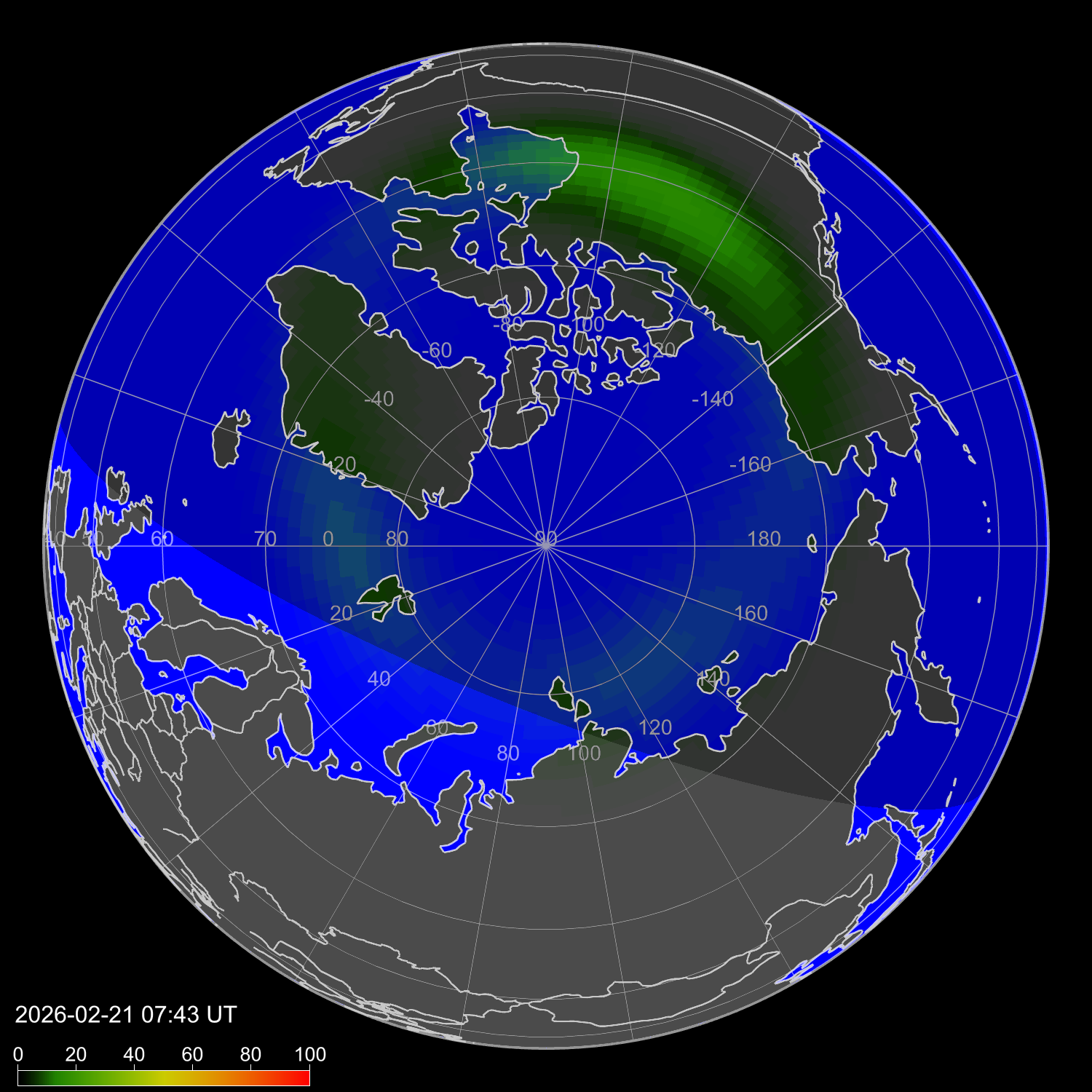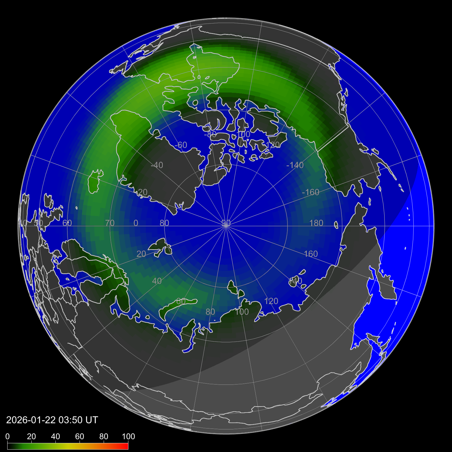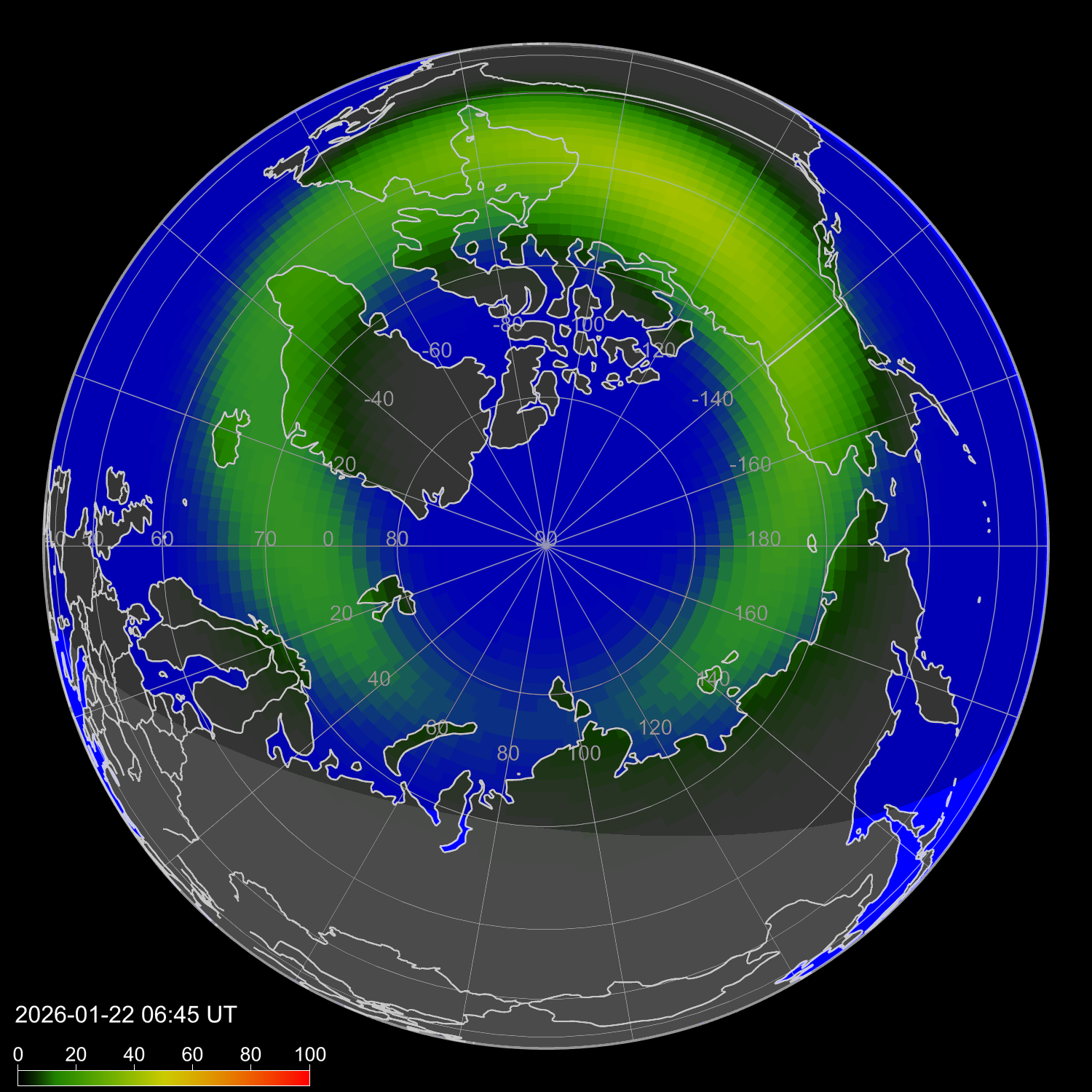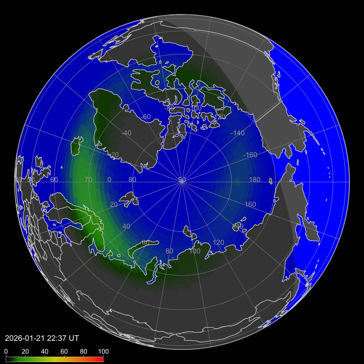 Индекс интенсивности полярных сияний и теоретически возможная широта наблюдений для ночного времени в западном полушарии