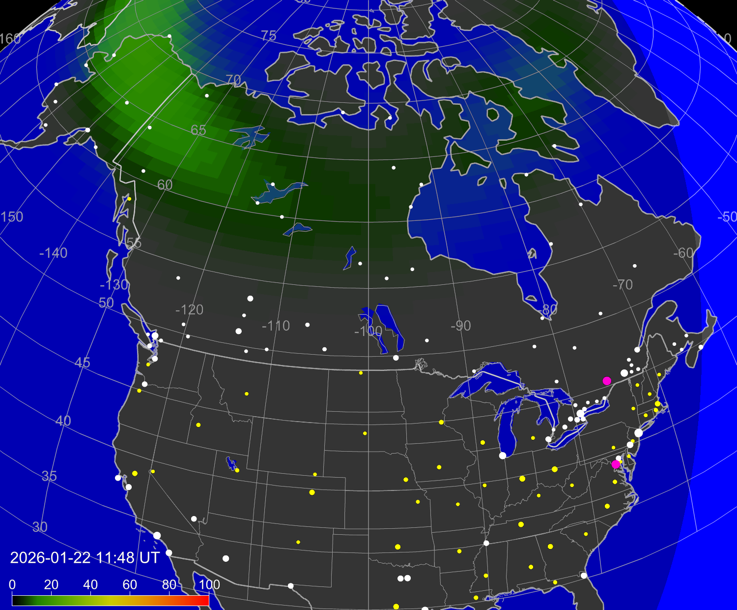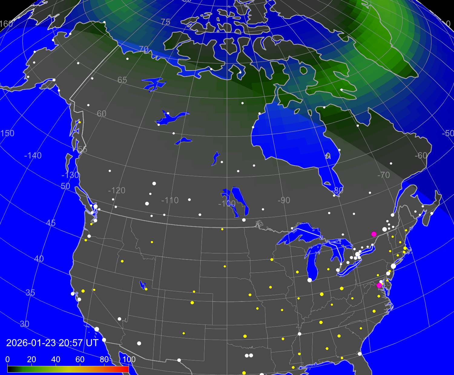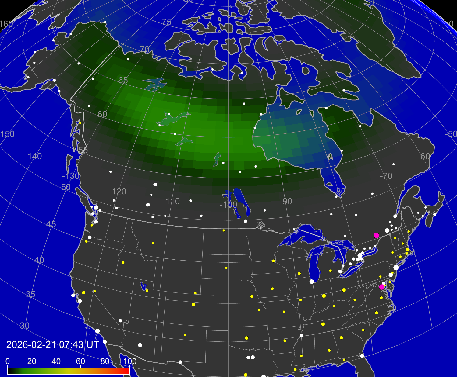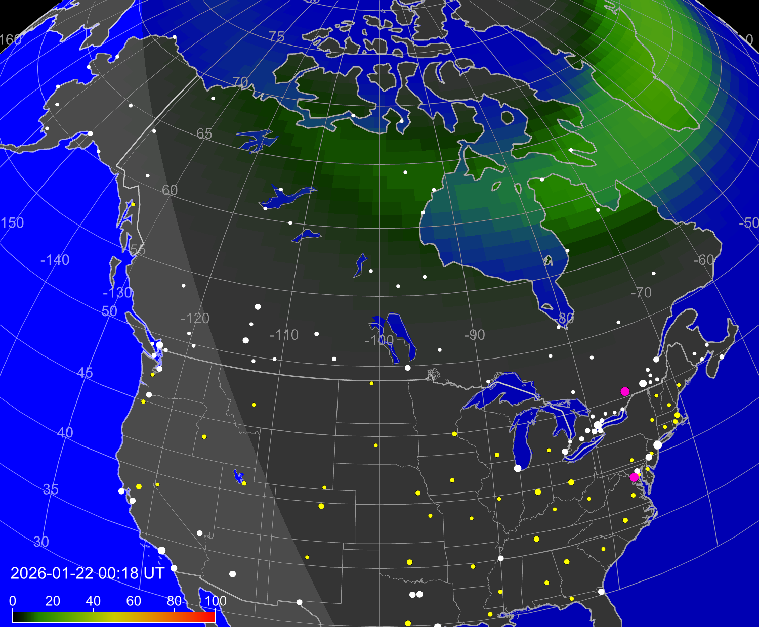 Индекс интенсивности полярных сияний и теоретически возможная широта наблюдений для ночного времени в западном полушарии
