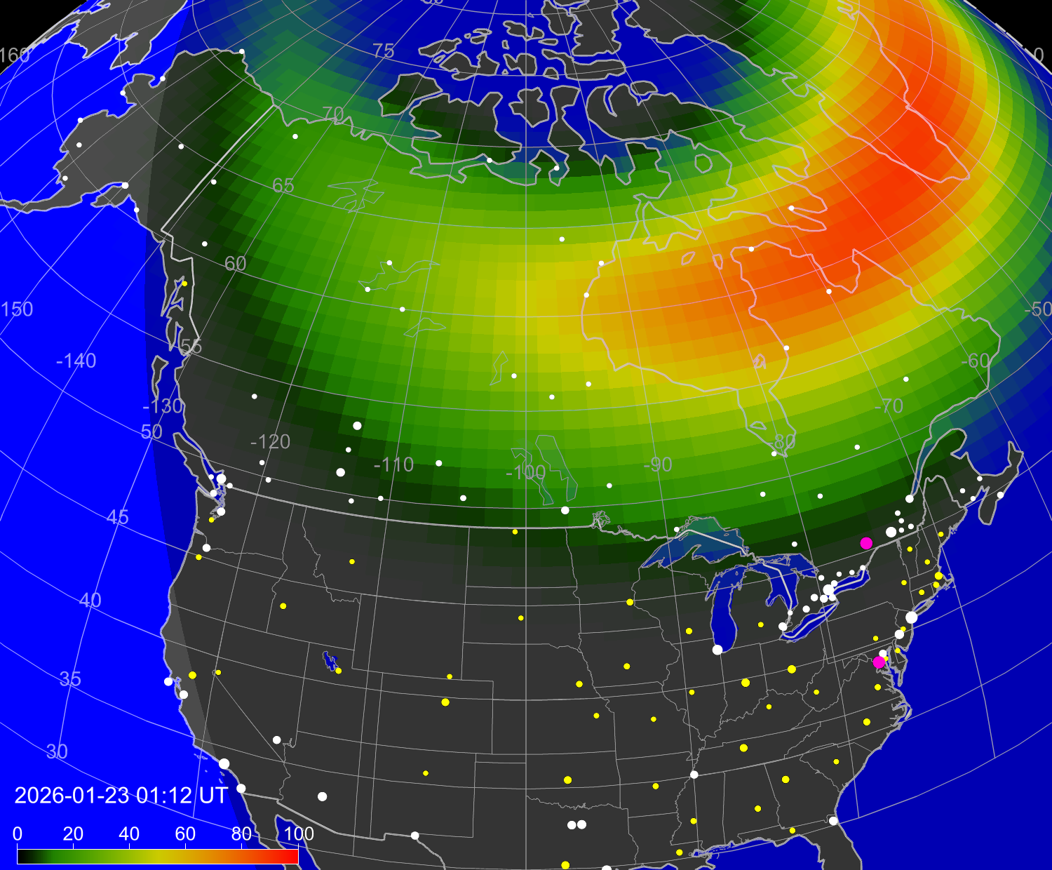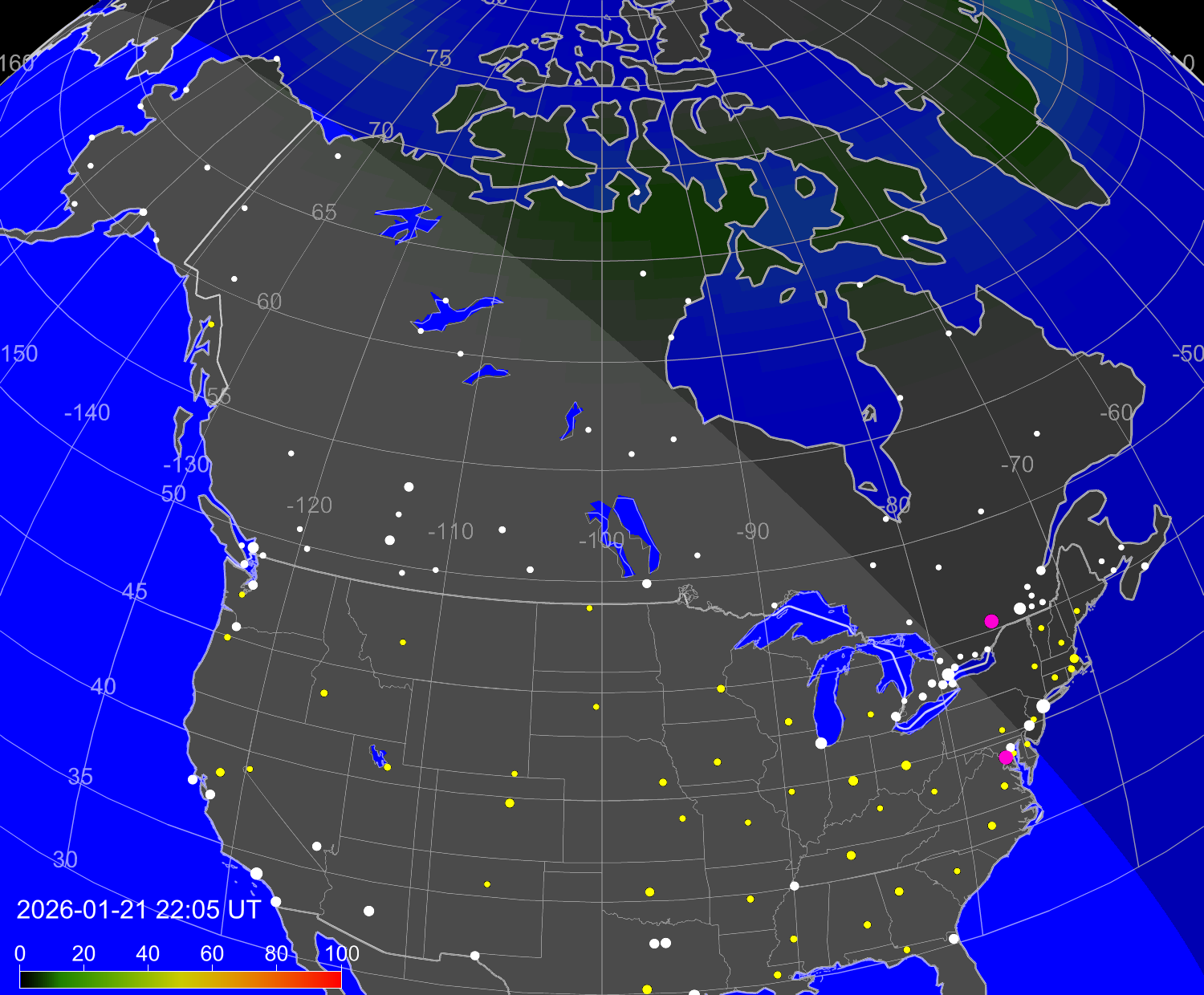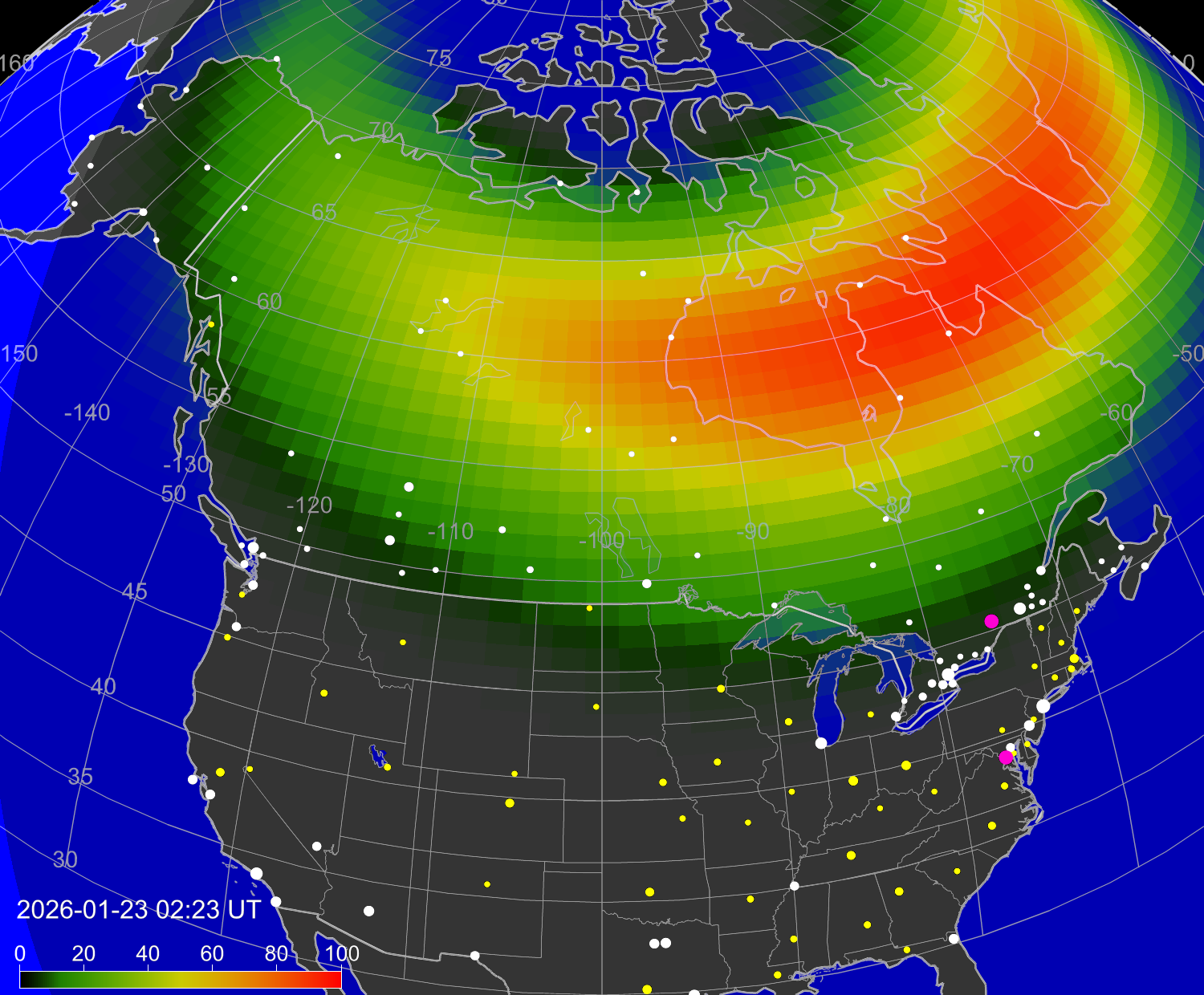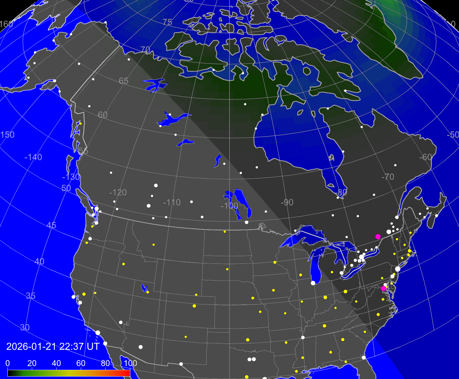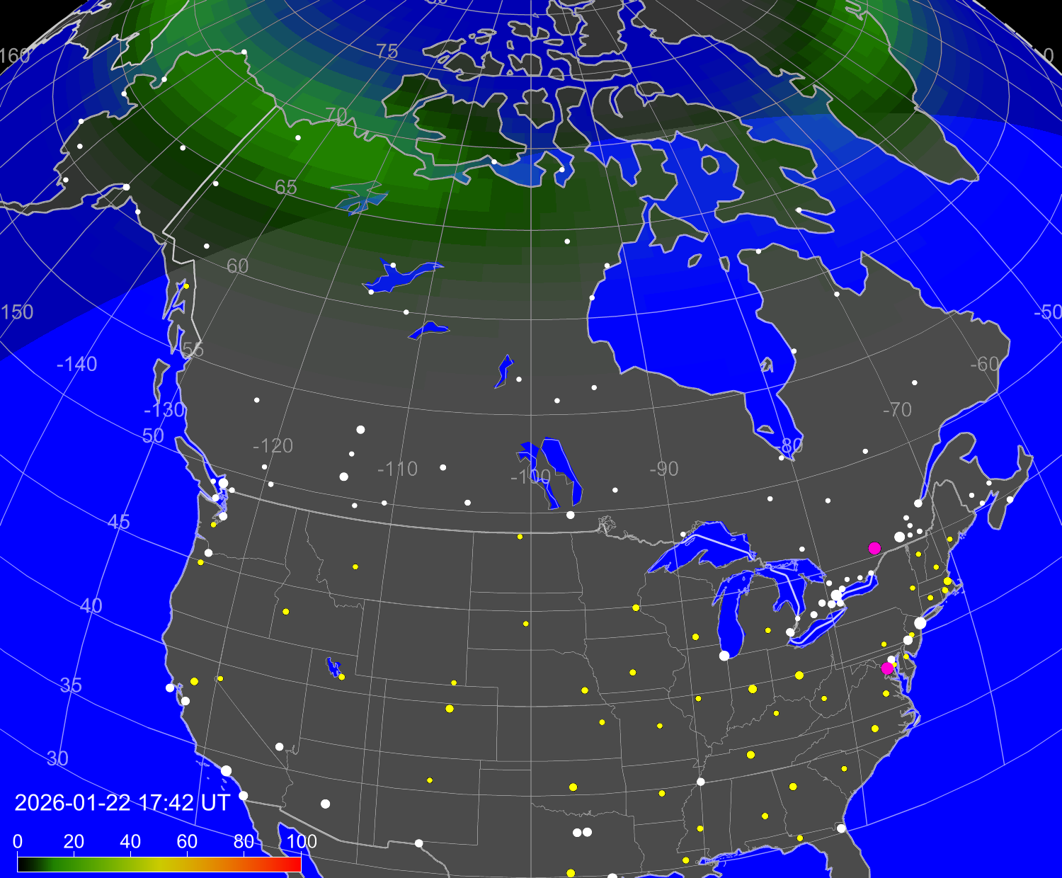 Индекс интенсивности полярных сияний и теоретически возможная широта наблюдений для ночного времени в западном полушарии