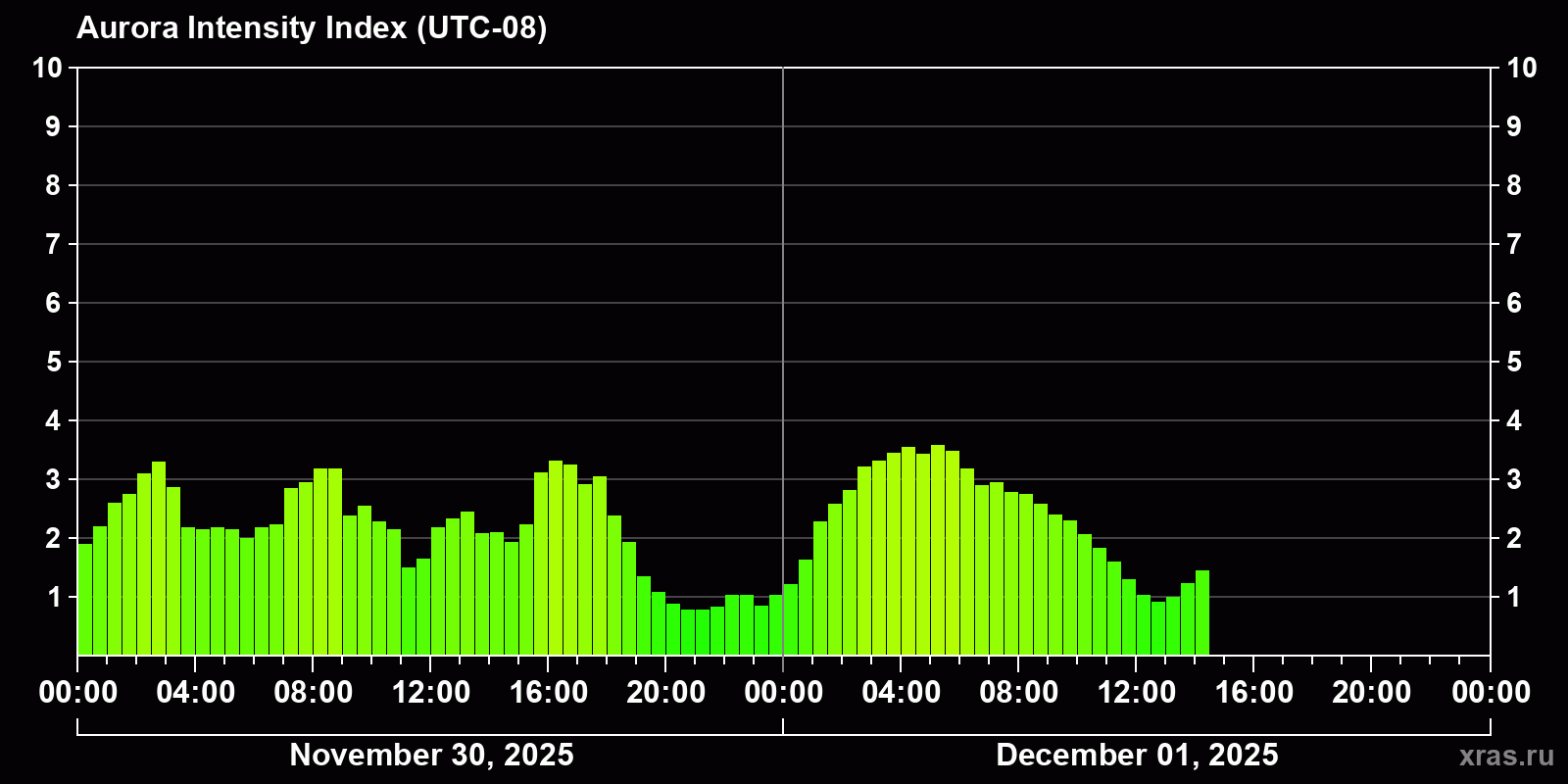 Auroral intensity index and the theoretically possible latitude of observations for nighttime in the Western Hemisphere as of 2025-12-01 06:25 (end of day) local time